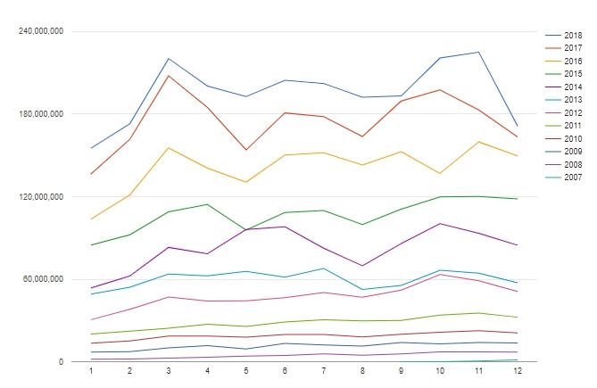 아래 그래프는 12월21일까지 티쿤 11년 월매출표.