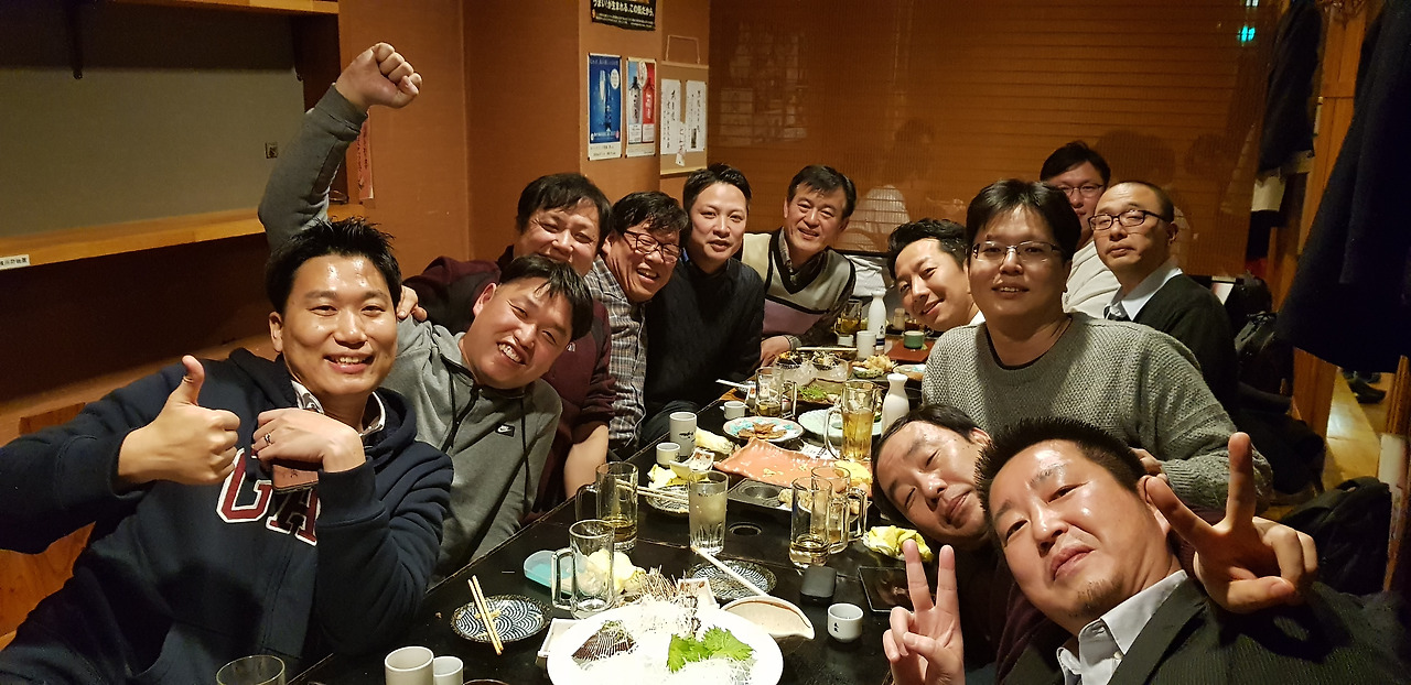 한국에서 일곱 명, 중국서 한 명, 도쿄서 한 명이 왔습니다. 오사카 임직원 세 명도 포함해서 저녁을 마음껏 먹었습니다. 출장자들은 작지만 방도 혼자 씁니다.