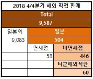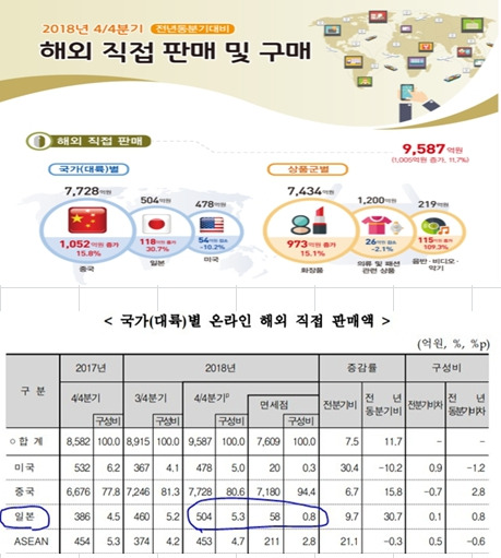 통계청에 따르면, 우리 나라 작년 4/4분기 일본직판액은 역직구와 해외쇼핑몰 입점을 합쳐 445억 원인 것으로 보여집니다. 면세점 매출을 포함하면 504억 원.