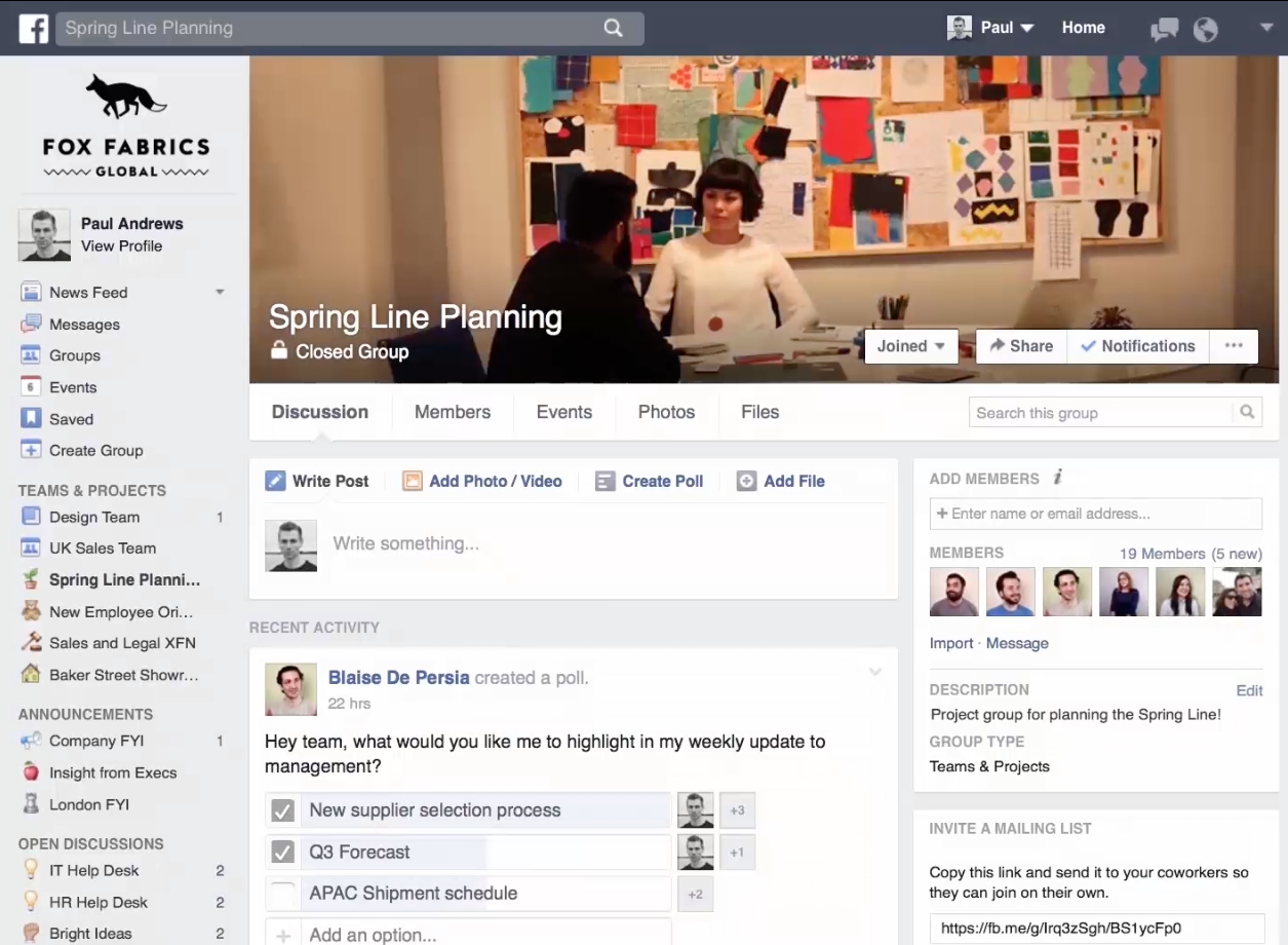 facebook이 그룹을 기본으로 하는 폐쇄형 공간을 메인 플랫폼으로 제공함은, 2009년 사내SNS라는 이름으로 바람을 일으켰던 툴이 실패로 돌아갔던 과거를 잘 기억하고 있는 듯 하다. 당시 사내SNS는 공개형 공간에 모든 정보를 공유해야 했고 조금이라도 수직이거나 정보의 보안에 민감한 조직에서는 사용할 수 없는 구조였던 것이다. 이에 대한 반성으로 Podio, Yammer 와 같은 Post방식의 기존 협업툴들이 폐쇄형 공간을 메인 플랫폼으로 변화하여 서비스해왔다.