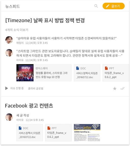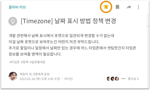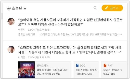 콜라비는 글 본문과 댓글에서 동료를(@이름) 호출하여 함께 협업을 할 수 있습니다.