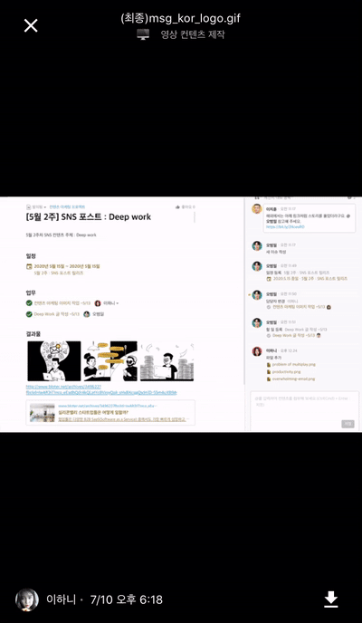 ▶ 정돈되지 않은 대화를 터치만으로 문서화 대화 히스토리를 남겨야 하거나, 할 일/일정 공유가 필요한 중요한 대화들은 터치 몇 번만으로 '협업툴 콜라비' 문서에 기록됩니다. 파일은 본문 내에 자동 기입되고 대화 문구는 댓글 스레드에 기록됩니다.