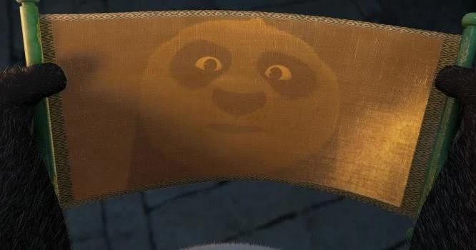 때가 되고 쿵푸를 배운 제자 팬더에게 전설의 용문서를 전하는 사부. 빛이 뿜어져 나오고 소리를 지르는 포. 하지만 용문서는 백지였다. 모든 것을 포기한 이들은 마을 사람들을 대피시키고 후퇴한다. 그러나 차마 길을 나서지 못하고 슬퍼하는 아들에게 아버지는 비밀로 해오던 국수를 만드는 비법을 알려준다. 특별 비법은 없었다. 그저 음식이 특별하다고 믿었기에 모두에게도 특별하게만 느껴졌을 뿐이다. 그제야 포는 용문서를 다시 펴서 그에 비친 자기 자신을 발견한다. “애초부터 비법 같은 건 없었던 거야.”
