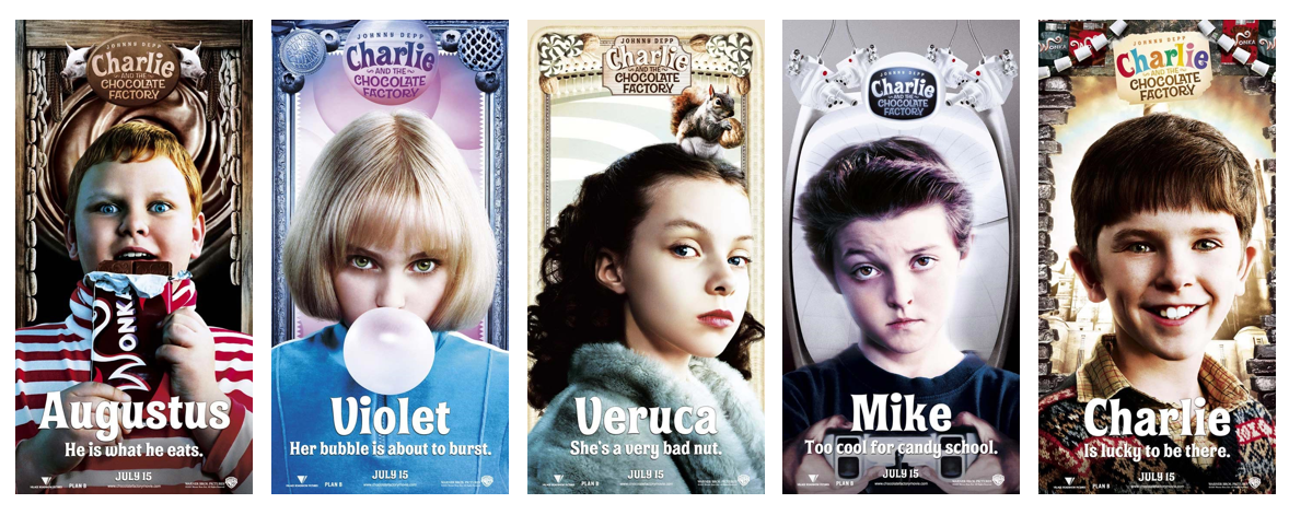 초대된 아이들은 환상적인 윌리 웡카 씨의 초콜릿 공장에서 각기 다른 시련을 맞이한다. 어쩌면 시련이 아니었을지도 모르는 네 개의 시련 앞에서 찰리를 제외한 아이들은 모두 집으로 돌아가게 된다. 그런데 이 네 가지 배경에서의 네 가지 시련은 정말 우연일까? 네 가지 아이들이 문제를 일으켜 탈락하게 될 때 모두 움파룸파들은 신나게 노래를 부른다. 뮤지컬의 한 장면 같은 움파룸파 족의 노래들은 모두 완벽하게 한 아이를 위해 짜여있다. 마치 웡카 씨가 아이들에 대한 사전 조사를 하고, 각각을 위한 덫을 준비해 놓은 것처럼 말이다. 그도 그럴 것이 바이올렛 색상의 블루베리로 변해버리는 껌을 바이올렛 앞에 보여줬으며, 호두 쓰레기장으로 던지는 물건 중에는 버루카 엄마의 초상화가 있다. 줄어든 마이크를 늘리기 위해 물엿 기계로 보내고 일행이 밖으로 나서자 티비 방 안의 움파룸파들은 기계를 셧다운 하고 밖으로 나선다. 그리고 모든 아이 중 유일하게 찰리만이 부모님이 아닌 할아버지와 공장에 방문했다. 아이들 앞에 놓인 네 개의 환상과 네 개의 시련은 과연 우연이었을까?