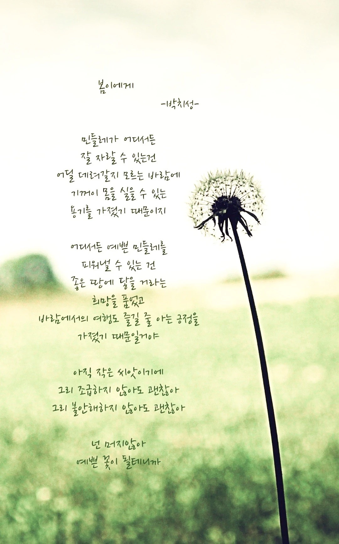 최근 일간지의 한 칼럼에서 <나는 커리어에 대한 야망은 전혀 없고 콩쿠르 우승과 상관없이 공부할 것이 많다. 상을 탔다고 실력이 달라지나? 나는 산에 들어가 피아노만 치고 싶다>라고 말한 반 클라이번의 최연소 우승자 홍안(17)의 메시지를 언제나 마음속에 새겨야겠습니다. 마지막으로 글쓰기를 포기하고 싶어질 때마다 위로가 되어주었던 박치성 님의 시 <봄이에게>를 소개하는 것으로 저 포함 새로운 출발선에 선 당신들을 응원하고자 합니다.