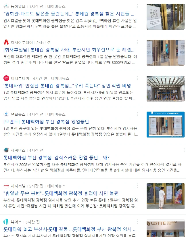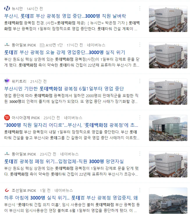 P.S - 3000명의 실직자를 양산하게 만든 게 롯데 잘못인지, 부산시의 잘못인지는 모르겠다. 아마도 공사를 재게 한다는 조건으로 부산시는 롯데 백화점을 허락하겠지만 이러한 사실을 알고 나서부터 롯데는 내 마음속에선 끝.