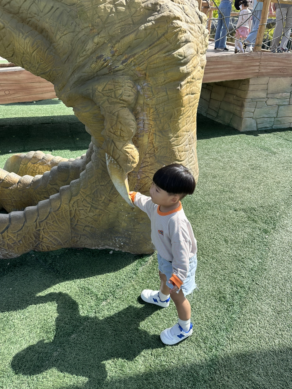 자기보다 몇 배나 큰 공룡 앞에서 포즈를 취하며 사진을 찍은 적은 처음이었다. 1년 전만 하더라도 시우는 눈앞에 보이는 스코미무스를 보고 울면서 도망가려고 했다. 지금은 스스로 포즈를 취하며 사진을 찍어 달라고 했을 정도다. 사진을 찍고 나서 재빠르게 내려오긴 했지만, 이전보다 발전된 모습이 너무 멋졌다. 예전에는 엄두도 내지 못했던 티라노사우르스를 정면으로 쳐다보고 만지기도 했다. 물론 티라노의 얼굴이나 이빨은 만지지 못하고 발톱과 발을 만지는 것이 고작이었다. 그래도 최강 공룡인 티라노사우르스의 발을 만진 시우는 뿌듯함을 느끼는 듯했다.