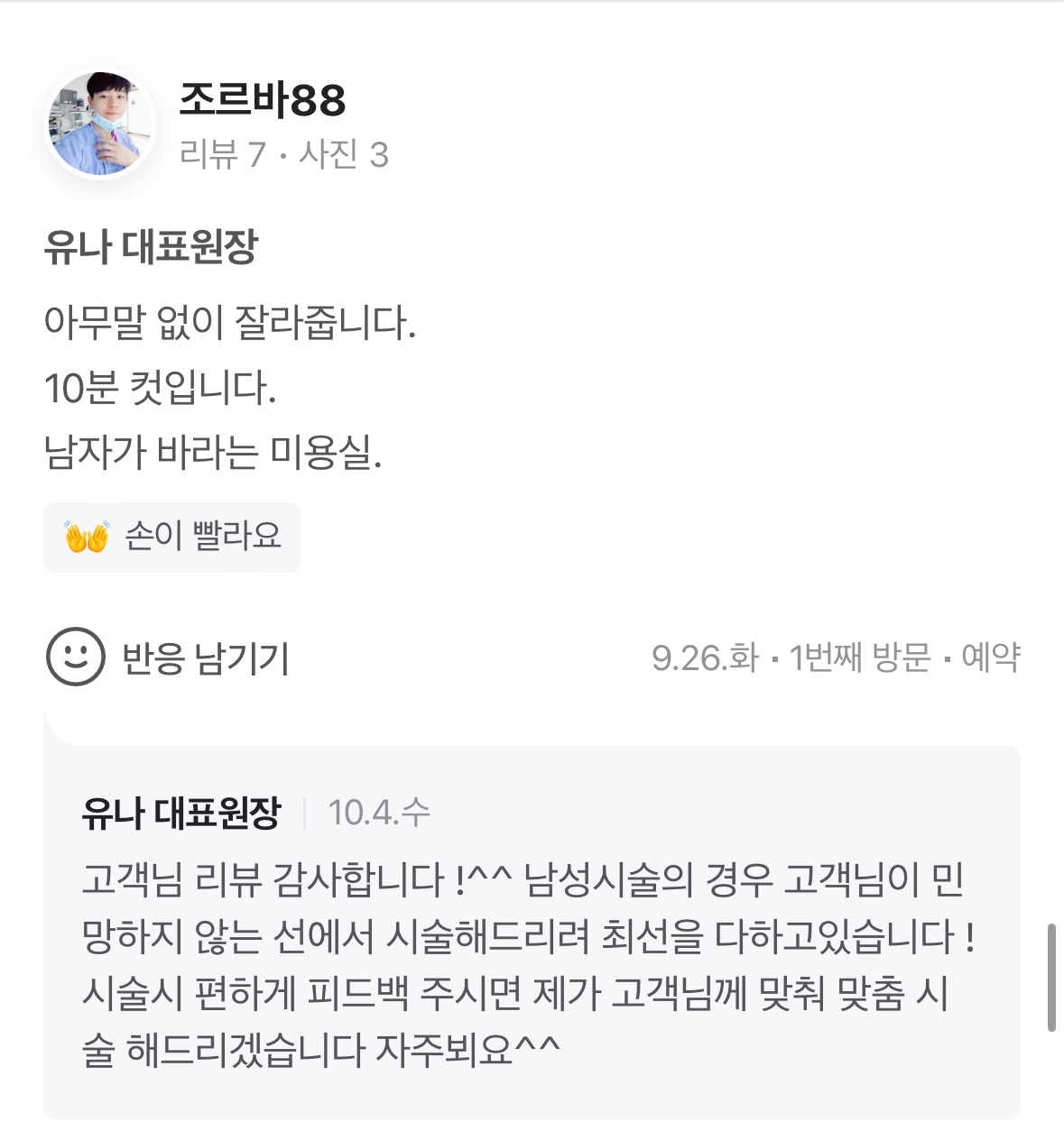 가격도 합리적이고 우리 아파트단지 맡은 편 상가에 있기 때문에 거리도 가깝다. 예약은 네이버로 하루나 이틀 전에 하는데, 당일에 전화해서 가능한지 답변도 해준다. 이곳은 없어지면 안 되는 곳이다. 내가 정착한 미용실이 오래오래 뿌리를 내려 나와 같은 관점을 가진 사람들이 많이 많이 애용했으면 한다.