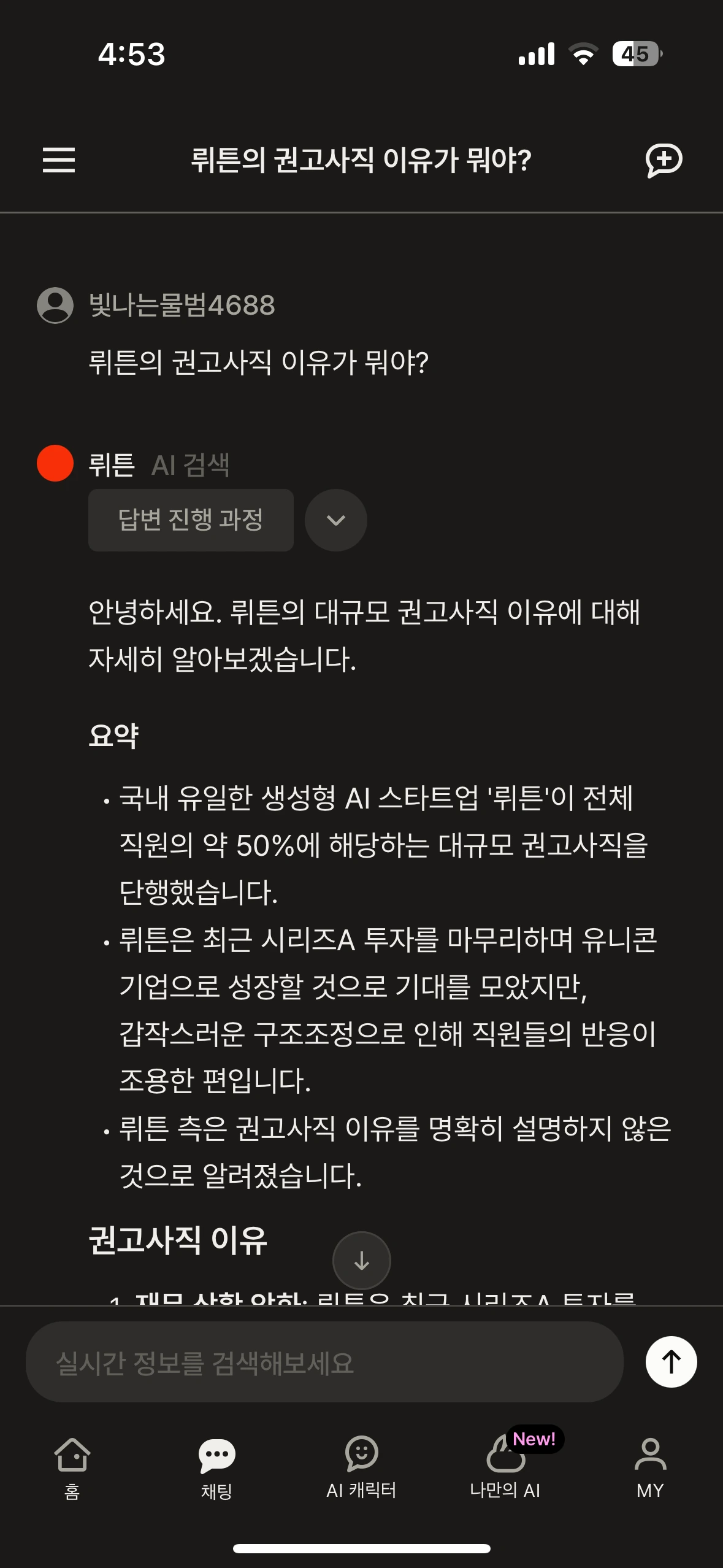 본인 회사의 권고사직의 이유를 기술하는데, 뉴스기사와 블라인드라는 사이트에서 글을 도출해 낸다. 말 그대로 도출이다. 여러 군데서 글과 자료를 합산해서 답변을 생성한다. 의료 관련 질문은 병원이나, 의료기기 업체, 논문등에서 정보를 취합한다. 정보의 근거가 있는 글들을 통해 답변을 만들기 때문에 신뢰도가 높은 답변을 하는 것이다. 내가 궁금했던 질문들을 척척 대답해 주는 뤼튼은, 챗 gtp보다 한국 사람이 쓰기 적합해 보인다. 한국인이 만든 포스팅이나 정보를 출처로 이용하는 것 같다.