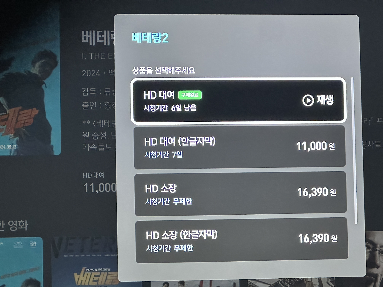 베테랑 2를 일주일간 대여해서 볼 수 있는 가격은 11000원이다. 한 달만 기다리면 OTT로 나오기 때문에 영화를 보는 비용이 아깝다고 생각했다. 하지만 아내는 보고 싶었던 영화가 VOD로 나오길 기다리고 있었다. 그리고 그 영화가 나왔다며 나에게 굳이(?) 알려주었다. VOD 영화를 재밌게 보는 아내의 모습을 보고나선 마음이 바뀌었다. 신작영화를 보고 싶었던 아내는 잠시나마 육아의 고충을 잊고 영화에 빠져든다.