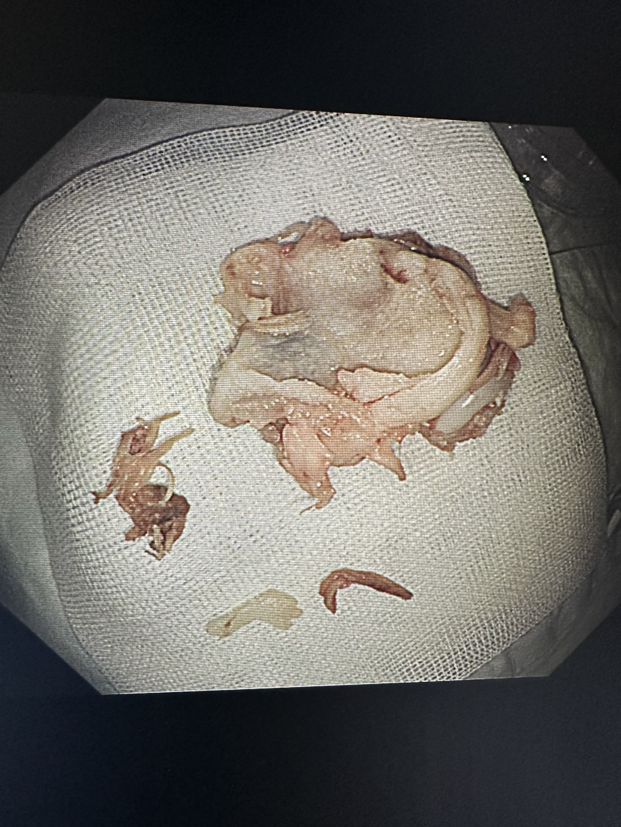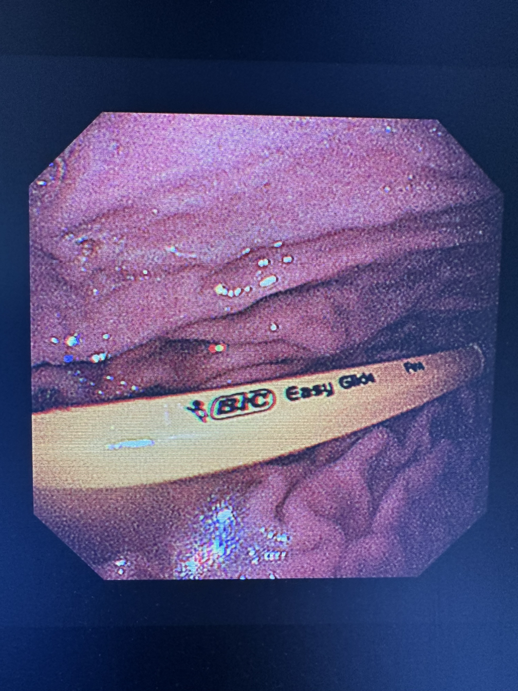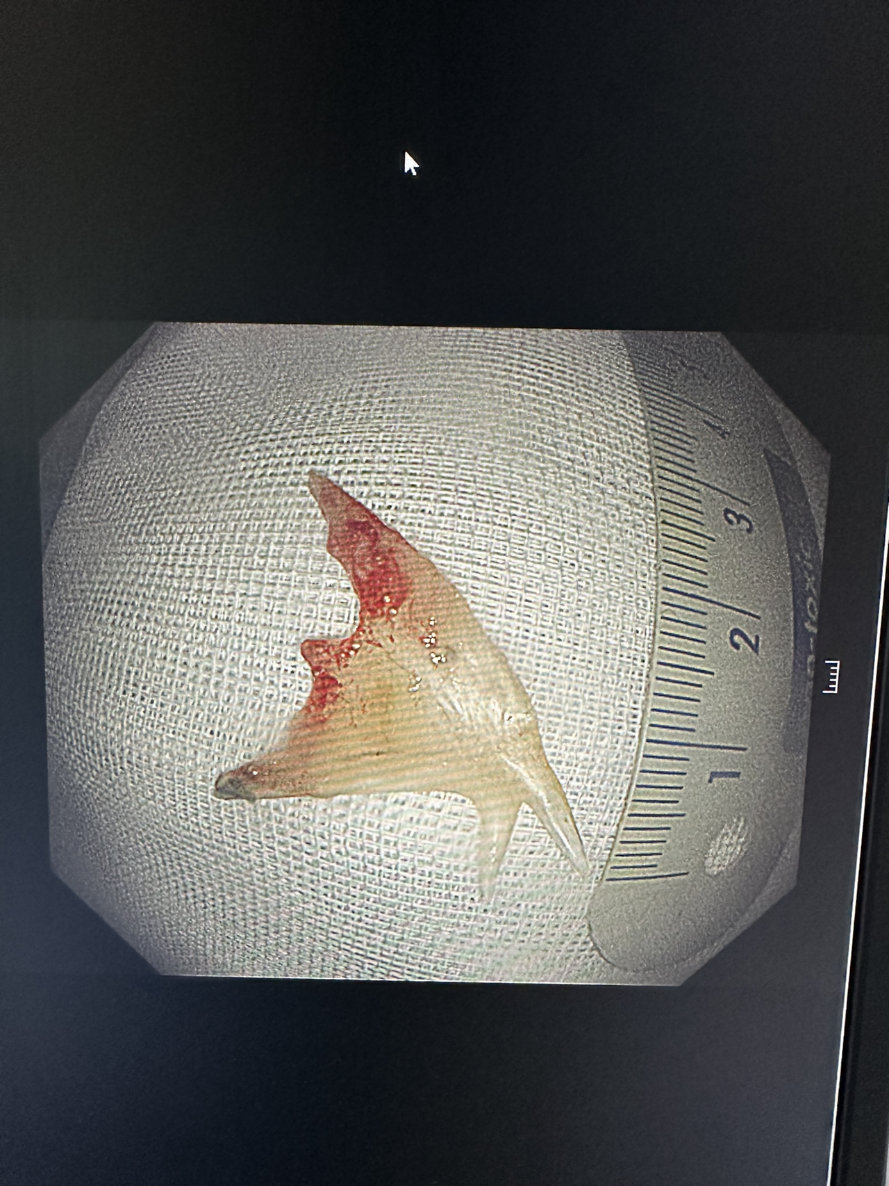 몇 개월 동안 뺐던 생선 가시들이다. 얼핏 보면 커 보이지 않지만 pyriforn sinus(이상와)의 크기보다 큰 이물들은 나오면서도 상처가 생길 수 있고 식도에도 상처를 입힌다. 몇 년 전, 생선 가시가 식도에 박혀있는 환자가 종합병원에서 내시경을 하고 응급실로 왔었다. CT상엔 동맥에 1/3이 침범해 있었고 가시가 박혀 있는 주변부는 농이 나오고 있었다. 다음날 수술실에서 흉부외과와 조인해서 내시경을 했다. 우리가 내시경으로 가이드를 하고 가시를 제거하면 출혈을 잡지 못할 것이기에 개흉수술을 바로 진행할 예정이었다. 다행히 출혈은 심하지 않았고 내시경적으로 해결할 수 있었지만 그 아찔함이란. 그만큼 생선가시를 삼키면 위험하다. 김치나 밥을 삼켜 빼는 것보단 내시경적으로 제거하는 것이 바람직하다.