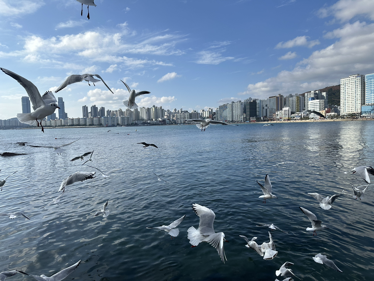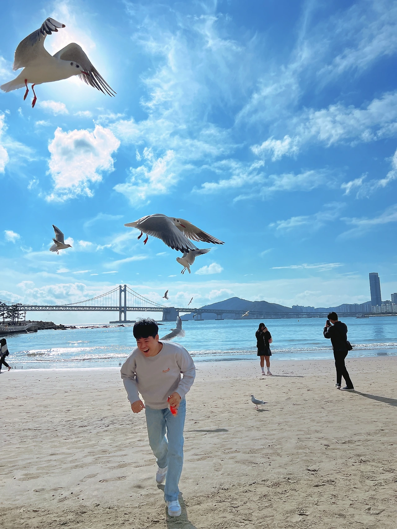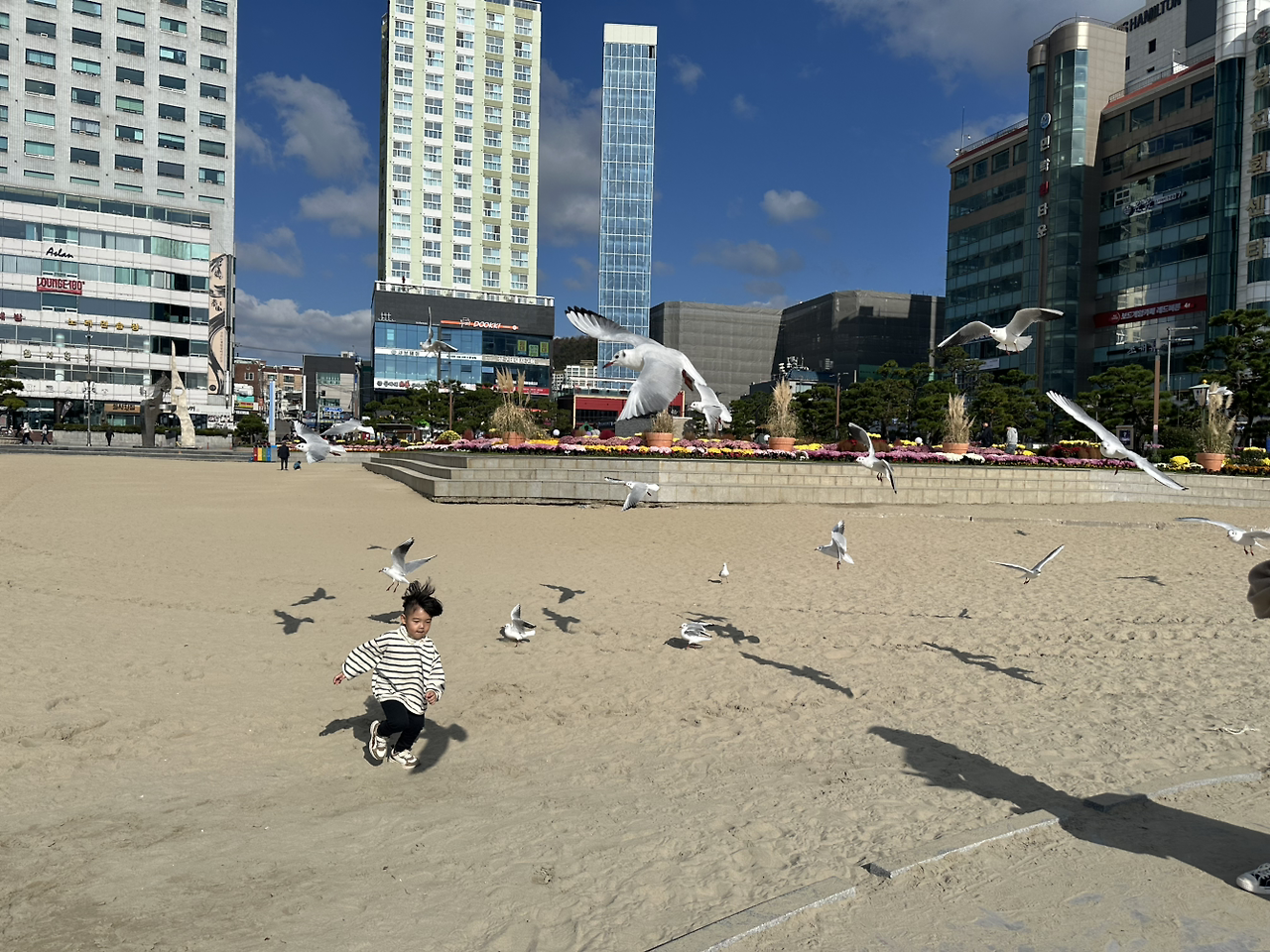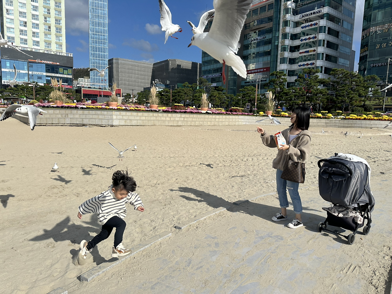 새우깡 한 봉지면 충분하다. 광안리를 노니는 갈매기의 대다수를 소환할 수 있다. 처음엔 시우가 무서워서 내가 대부분 먹이를 줬지만, 지금은 먼저 던져 준다. 아들이 무언가를 두려워하지 않고 극복하는 모습을 보니 뿌듯하다. 점점 성장하는 아들.