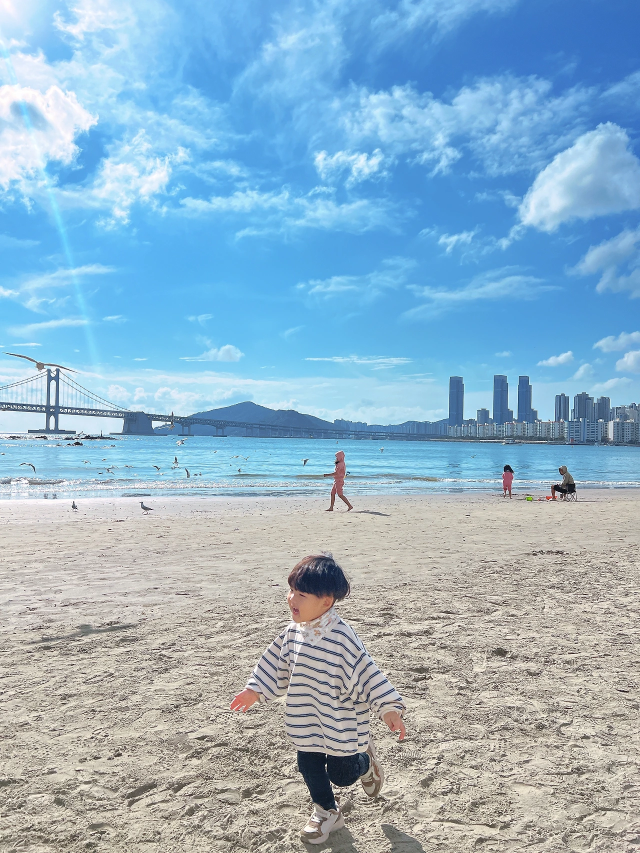 날이 좋다. 아직은 덜 추운 가을. 우리는 광안리 해수욕장으로 간다. 우리 집에서 차로 20분이 안 걸리는 광안리는 자주 찾던 곳이었다. 바람이 불어서 피하고 많은 인파에 치여서 자주 가지 못했다. 사실 시우가 모래에서 장난을 치고 싶어 해서 해수욕장은 피하는 편이다. 주차공간이 부족한 것도 하나의 이유다. 수영구청, 광안리 공영주차장, 민락더마켓등에 주차를 하는 편이다.