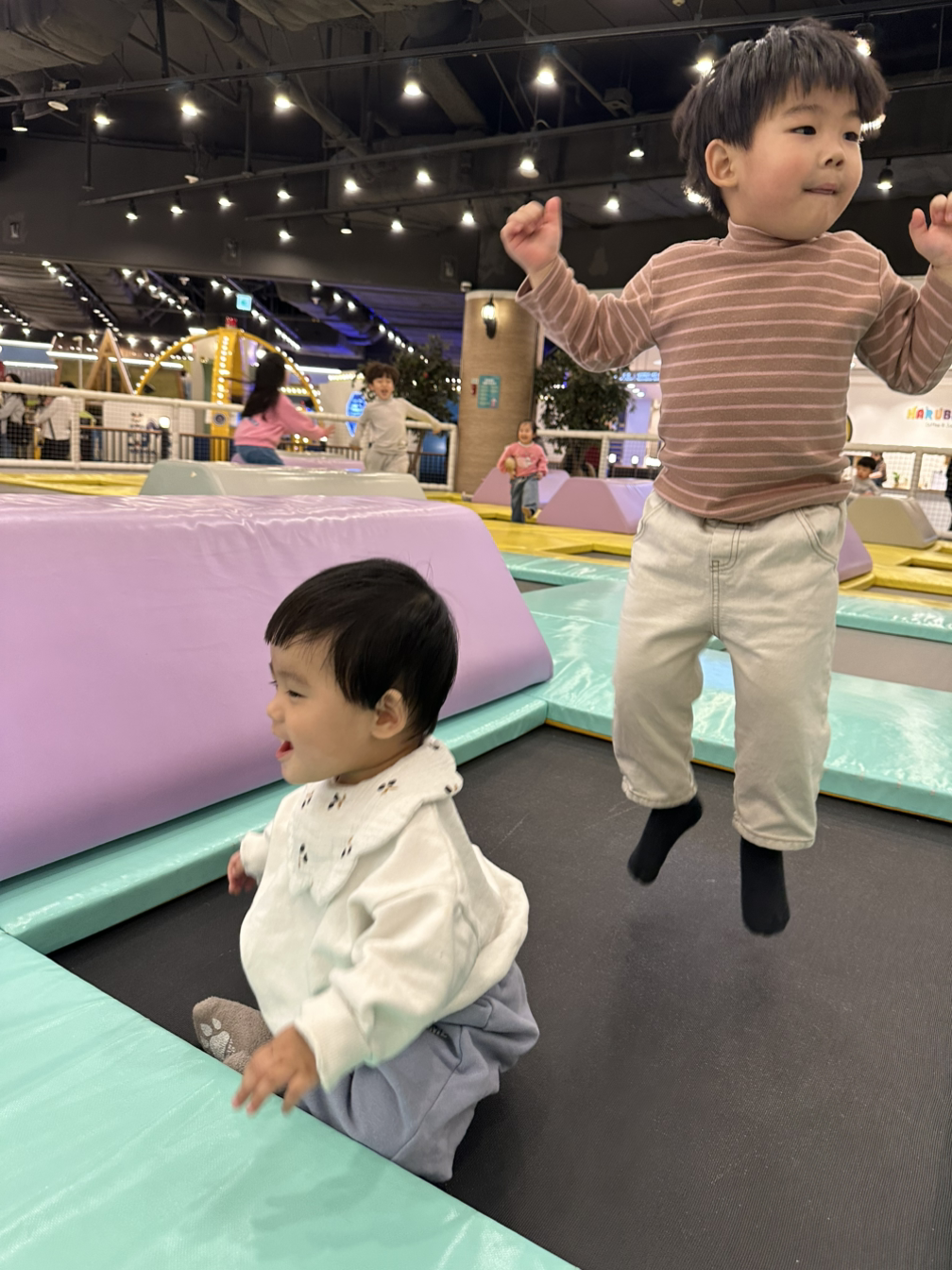 오후에는 닥터벨런스라는 키즈카페에 가서 시간을 보낸다. 두 시간의 제한시간을 알차게 사용하며 아들과 함께 놀았다. 부모도 아이도 많은 주말이다 보니, 카페 테이블을 잡기가 어렵다. 운 좋고 기술 좋은 아내가 테이블을 잡아서 짐을 올려 둘 수 있었다.