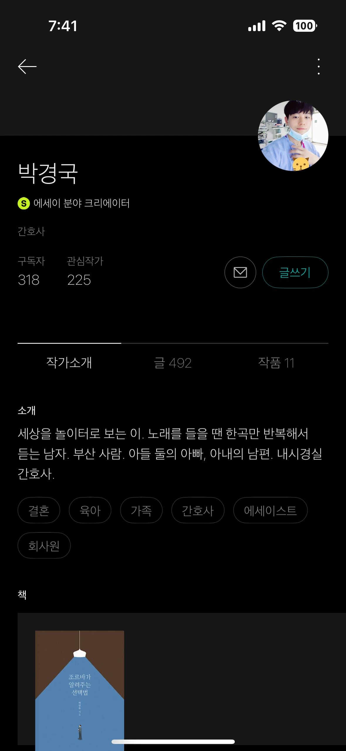 이 소개란을 채울 당시엔 세상을 놀이터로 생각했나 보다. 지금도 큰 변화는 없지만 마냥 안전한 놀이터는 아니란 걸 깨닫고 있다. 좋아하는 노래를 반복해서 듣는 성향과 살고 있는 지역도 기록해 놓았다. 예전에는 남편과 아빠라는 타이틀이 첫 줄에 있었다. 아빠와 남편은 관계 속에서 정의되는 표현이다. 나라는 존재를 관계가 아닌 곳에서 이야기하고 싶었던 건 아니었을까?
