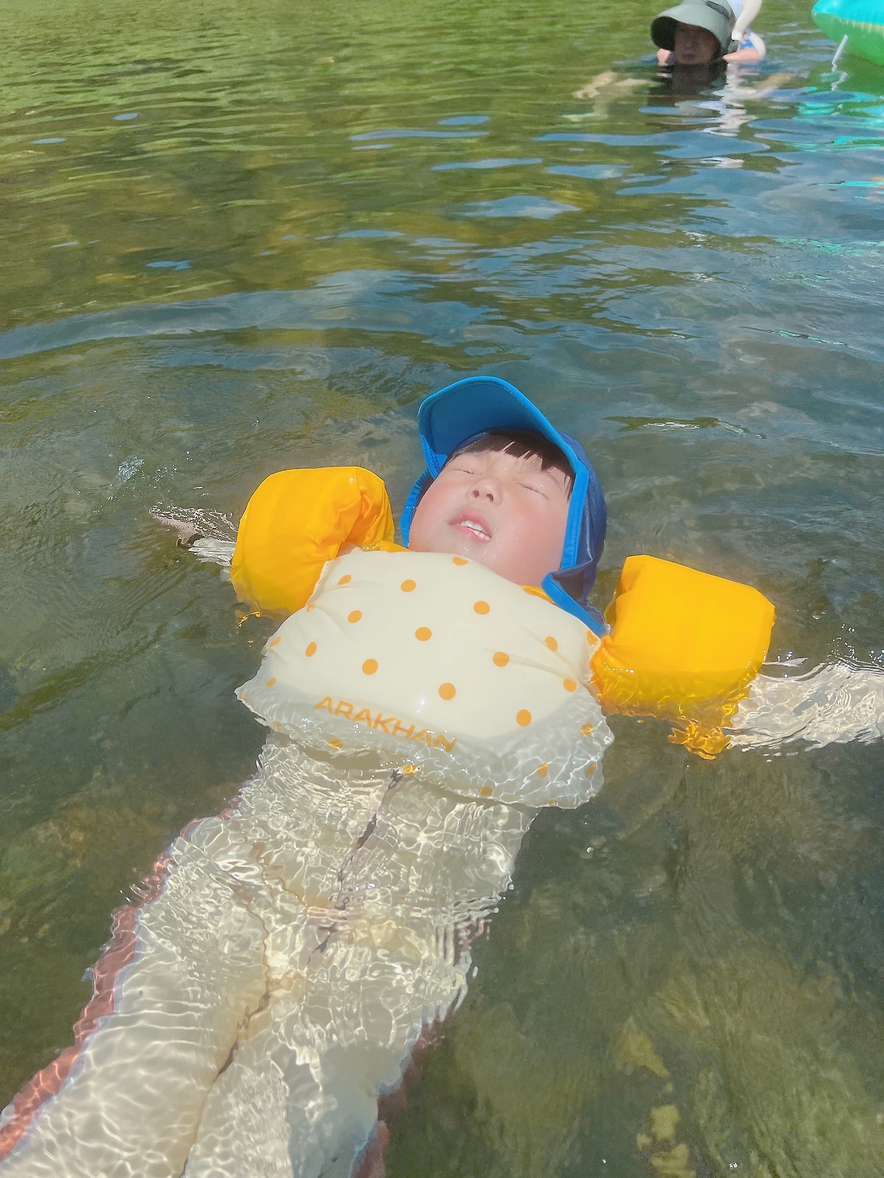 시우의 유치원 친구들의 가족과 함께 했다. 같은 아파트에 살고 있고 시우가 어린이집에 다닐 때부터 알고 지냈던 가족들이다. 일 년에 몇 번씩은 함께 가는데, 한가족은 일이 있어서 참석하지 못했고 네 가족이 물놀이를 즐겼다. 평상 두 개를 빌렸는데 아이를 포함한 열네 명의 인원이 앉기에도 부족하지 않았다. 양산 쪽 평상은 다른 지역과 다르게 사이드 평상을 주기 때문에 식사를 하거나 짐을 두는데도 용이하다. 평상 크기도 다른 곳보다 넓어서 만족스러웠다. 평상 사이의 간격이 가깝긴 하지만, 평상 두 개가 아닌 네 개를 쓰니 충분히 메리트가 있다.