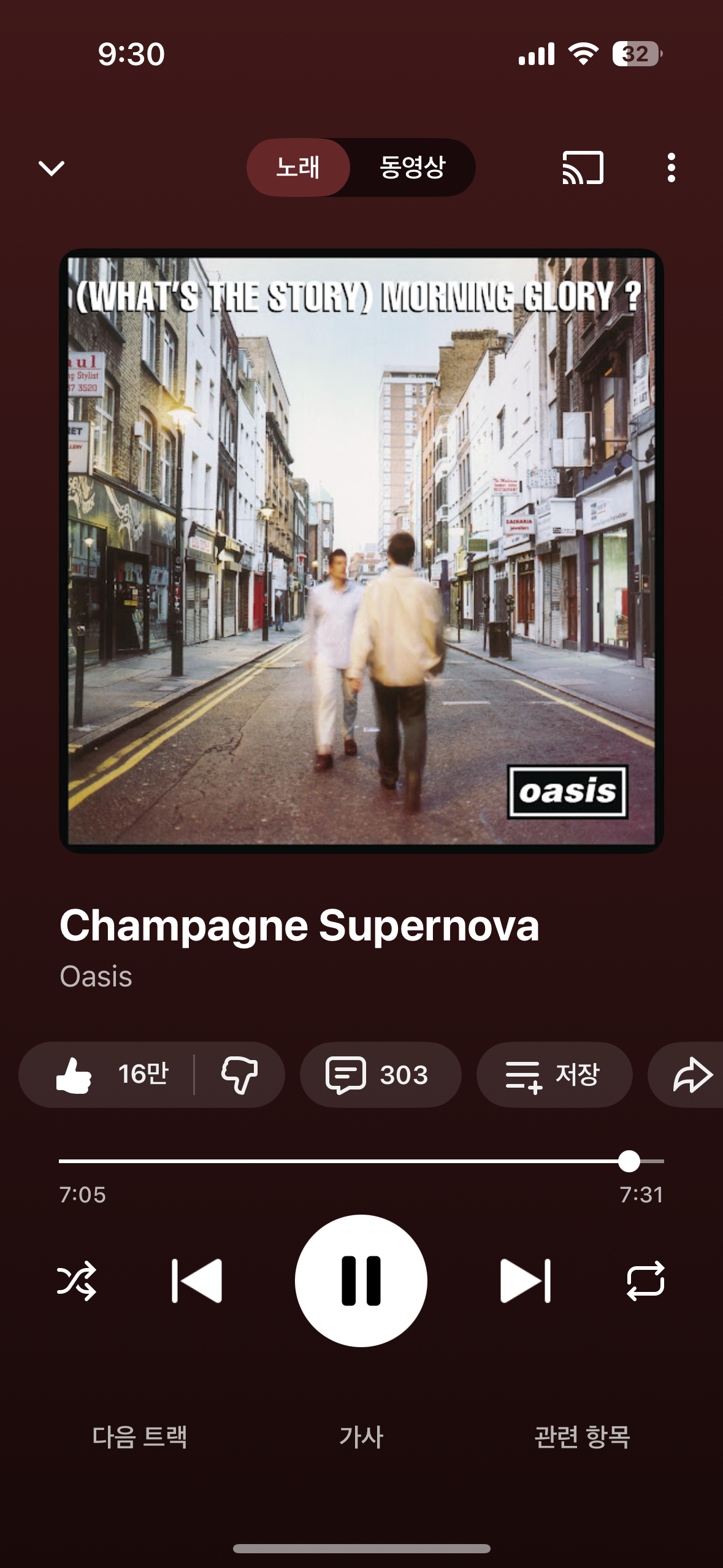 리암 갤러거의 목소리는 이 노래를 한 차원 더 높은 경지로 만들었다. 나에게 기타 솔로가 전부였던 시절에는 리암의 보컬을 크게 신경 쓰지 않았다. 노엘의 작곡과 솔로에 대한 찬사만 했을 뿐. 지금 들어보니 리암의 목소리는 시대를 담고 있다. 밴드의 프론트 맨이자 보컬인 그가 없었다면 오아시스는 존재하지 않았을 거다. 이후의 앨범들이 혹평을 받아도 2집 Morning glory 앨범과 비교 선상에 있는 앨범은 이 세상에 존재치 않는다. 영국락의 절정을 이끌고 하락을 이끌어낸 그들을 비난하곤 하지만 시대의 선택이었을 뿐. 좋은 곡들로 내 삶을 채워준 그들이 고마울 따름이다.