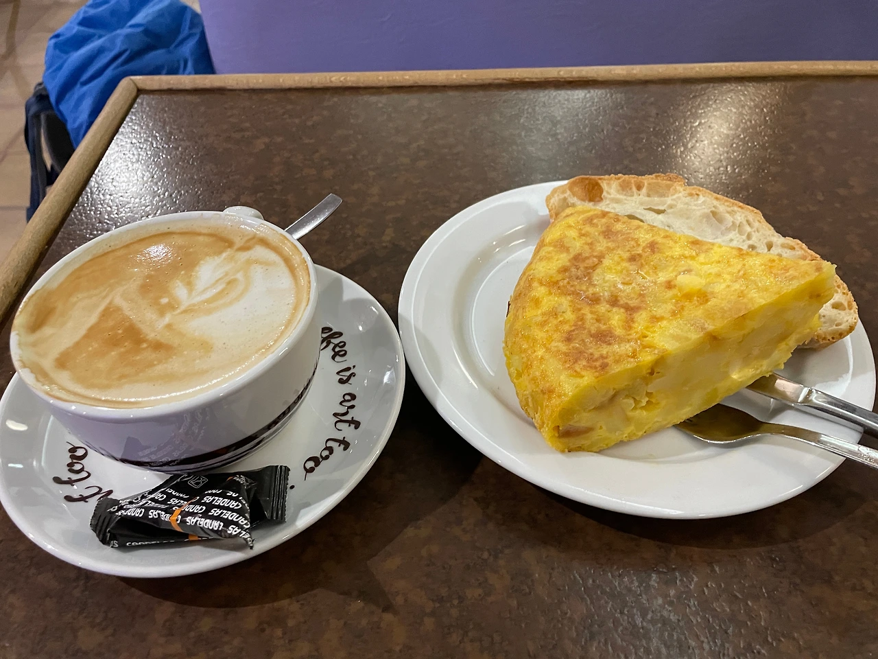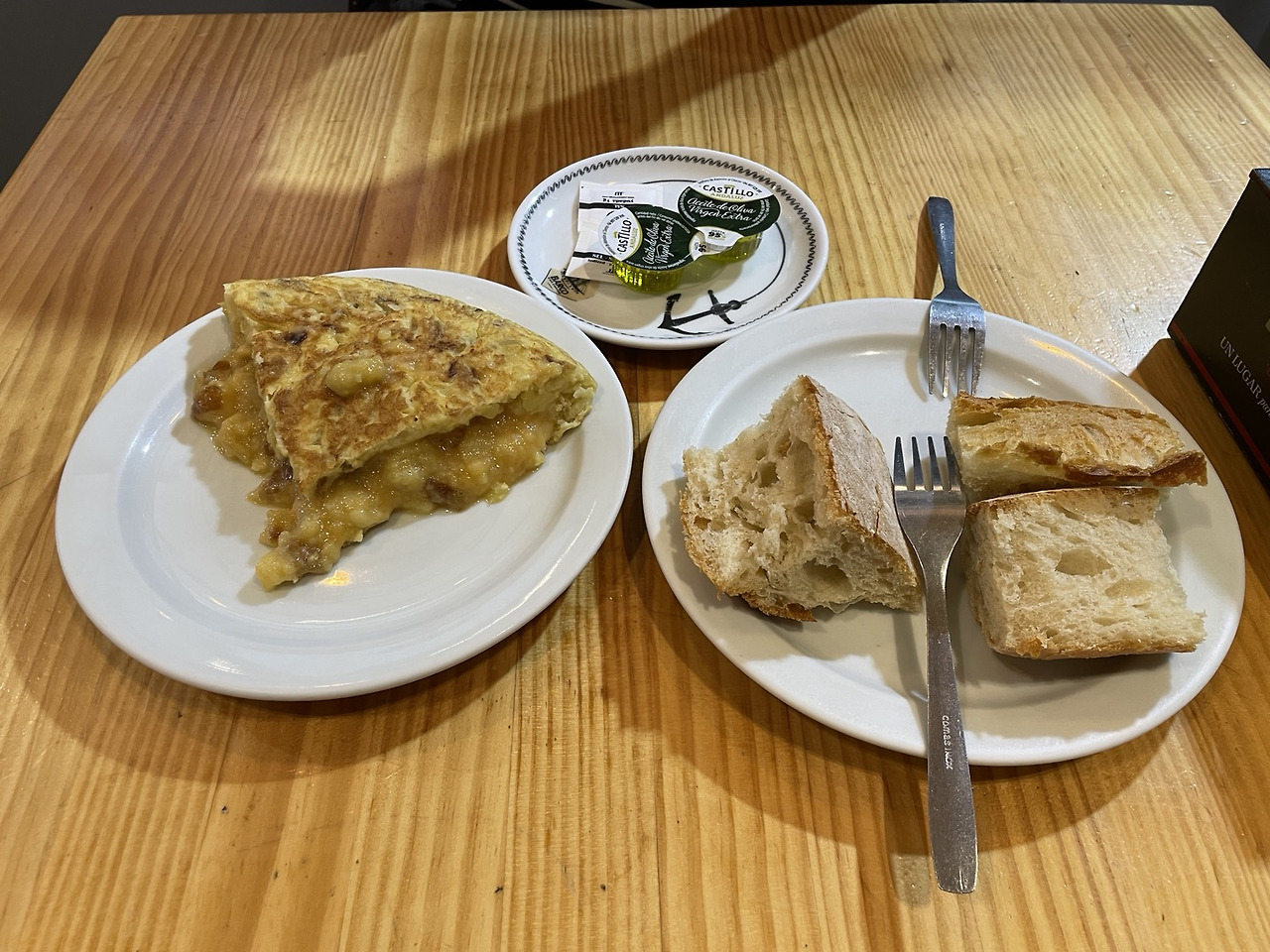 스페인 내에서도 또르띠야는 아무 데서나 먹으면 맛이 없다. 구글 리뷰에 스페인 사람들이 사진과 함께 남긴 코멘트를 잘 읽어보고, 또르띠야를 잘하는 집에서 먹으면 혼자 2조각도 거뜬히 먹을 수 있다. 참고로 또르띠야 1조각을 먹으려면 Pincho de Tortilla(핀초 데 또르띠야)를 주문해야 한다. 서빙하는 사람이 되묻긴 하겠지만, 그냥 Tortilla를 시키면 작은 피자 1판 사이즈만 한 또르띠야가 나올 수 있으니 유의해야 한다.