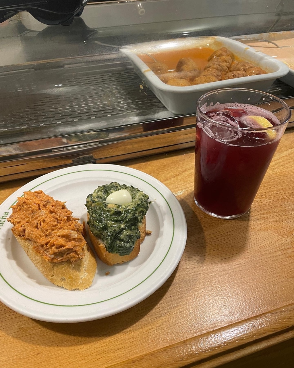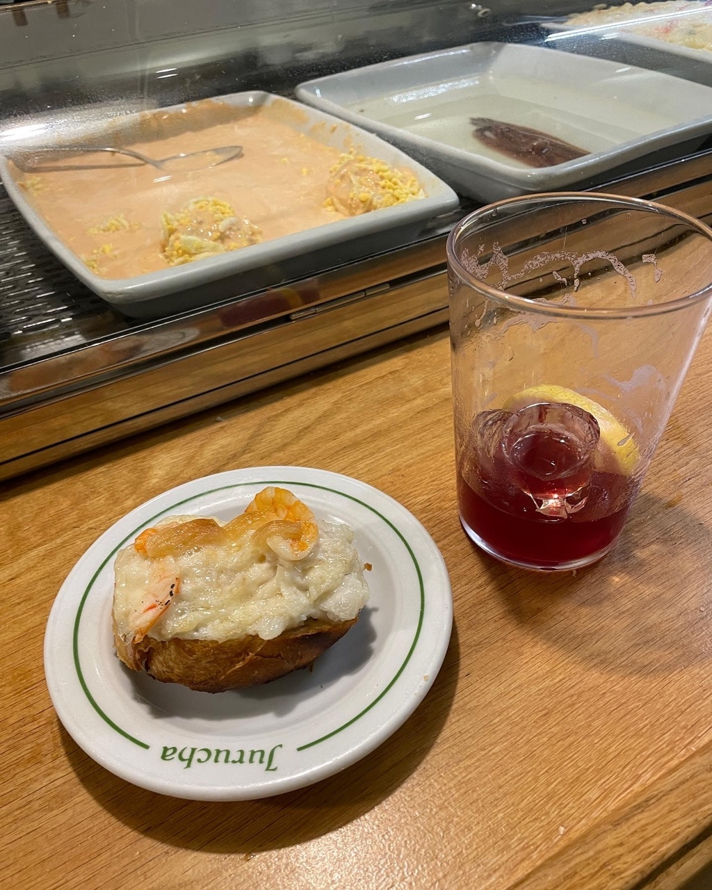 제대로 된 삔초를 즐기고 싶다면 삔초의 고향인 바스크 도시들(빌바오, 산세바스티안 등)에서 먹어볼 것을 권하고 싶지만, 한국 여행객들은 마드리드나 바르셀로나 위주로 관광을 하고 가는 경우가 많을 것이다. 스페인 바스크 지역을 여행한 이후, 나는 한참 '삔초 앓이'를 겪었다. 그래서 거주하고 있는 마드리드의 다양한 삔초 가게를 방문해 보았다. 그중에서도 내가 손꼽는 식당은 마드리드 살라망카 지역에 위치한 'Jurucha'라는 식당이다. 1961년에 오픈한 이 식당은 클래식한 인테리어를 보여준다. 길게 쭉 이어진 테이블에 서서 삔초를 골라 먹는 것이 이 식당의 포인트이다. 마치 한국에서 길거리 포장마차에서 서서 떡볶이를 먹는 것처럼 말이다. 그래서 그런지, 퇴근한 직장인으로 추정되는 중년의 스페인 남성들이 집에 들어가기 전에 혼자 간단하게 삔초 1개와 아주 작은 잔의 맥주(Caña) 한잔을 걸치고 무심코 동전을 툭 놓고 계산하고 가는, 느낌 있는 유럽 감성을 목격할 수 있다. 식당 안쪽과 테라스에 앉아서 먹는 자리도 있지만, 이런 느낌 있는 느낌이 나지 않는다. 이 집에는 다양한 삔초가 있지만, Merluza(대구 비슷한 흰 살 생선) 삔초를 꼭 먹어보길 추천한다.