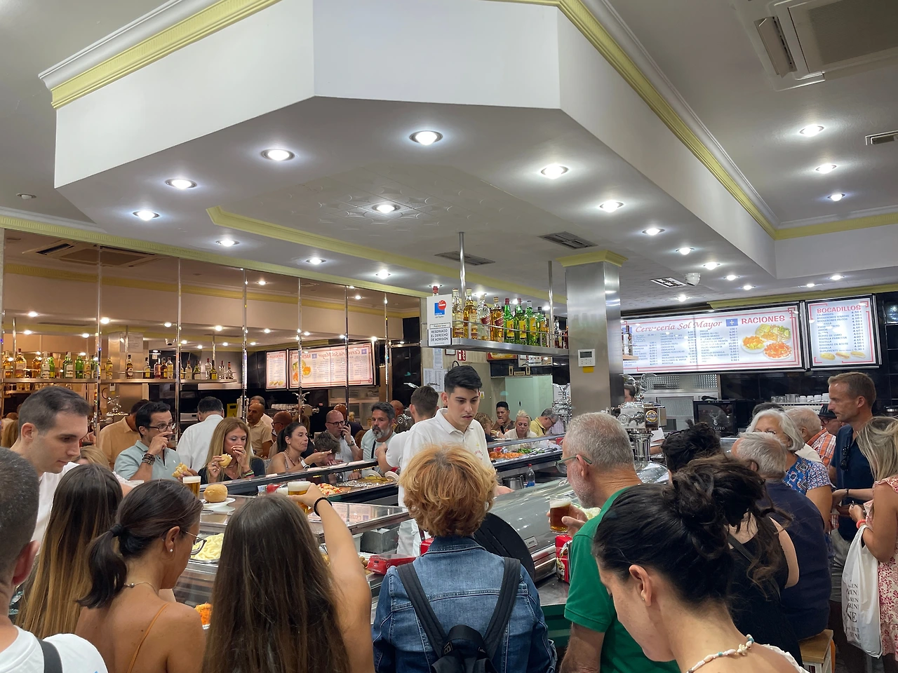 이쯤에서 식당을 추천하면, 마드리드의 솔광장과 마요르 광장 사이에 Cervecería Sol Mayor라는 식당이 있다. 이 곳은 전통적인 스페인 현지 바(Bar)다. 이곳은 여러 타파스를 팔지만, 특히 오징어 튀김이 들어간 보까디요로 유명하다. 신선한 오징어를 바삭하게 튀겨서 맛있는 것 같다. 사장님의 인심이 후한지, 오징어 튀김도 많이 넣어준다. 마드리드 시내에 위치하고 있기 때문에, 밤늦게 시내 야경을 감상하다가 허기진 배를 이끌고 들어가면 최고의 오징어 튀김 샌드위치를 맛볼 수 있다. 이 식당은 성격 급한 한국인의 마음을 알기라도 하는 듯, 보까디요를 주문하면 음식이 금방 나온다. 단, 이 식당의 최대 단점은 주문하는 것이 어렵다는 것이다. 식당 내부가 좁고 사람이 많아서 종업원들과 아이컨택을 잘해야 한다. 아이컨택이 되면, 음식을 주문하고 결제를 한 뒤, 그 앞에서 음식을 받는 식이다. 용기 내어 사람들을 뚫고 종업원과 아이컨택이 이루어지지 않으면, 남들이 먹는 거만 구경하고 올 수도 있다.(실제로 그런 관광객들을 종종 본다). 그리고 항상 사람이 많아 높은 확률로 서서 먹게 될 것이다. 그래도 이런 바의 시끌벅적한 분위기가 스페인 바(bar)의 찐 of 찐 풍경이니, 한번쯤 경험해 보는 것도 재미있을 것이다.