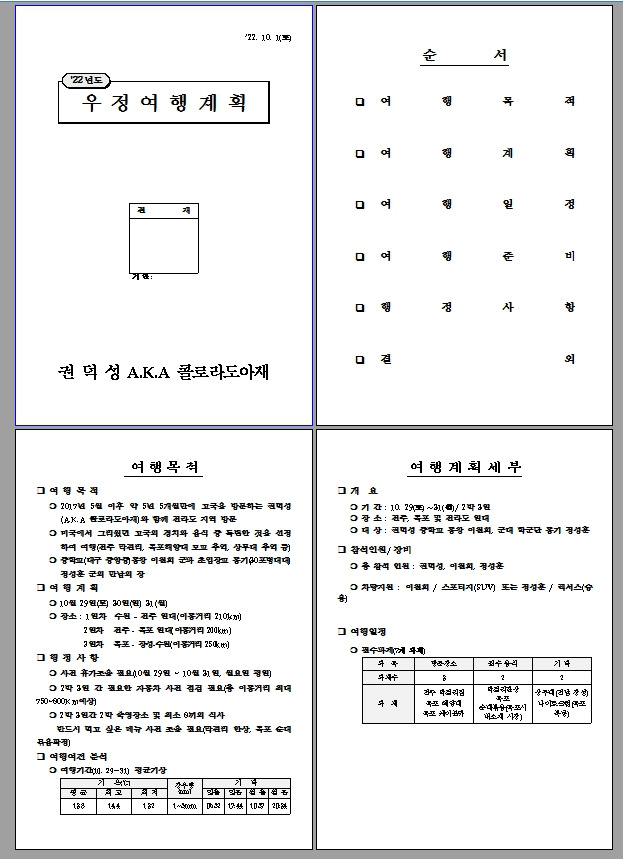 제주도와 울릉도를 제외하고는 전국을 돌아다니며 대학생활과 직장생활을 했었다 보니, 다시 가보고 싶은 장소를 찾아가는 것도 이번 여행에 포함되었다. 다행히 친구(콜로라도아재는 아무에게나 친구 호칭을 부여하지 않음, 동기 혹은 동창으로 등급을 나누어 명칭)가 휴가 낼 테니 자기랑 같이 다니자는 제안으로 덕분에 며칠 전에는 친구와 떠나는 '우정여행'을 계획해보면서 재밌기도 하였다. 군에서 문서 작성했던 경험을 최대한 살려 작성해보는 즐거움도 느꼈고, 언제 어디서 무엇을 할지 계획하는 것도 재밌었다.