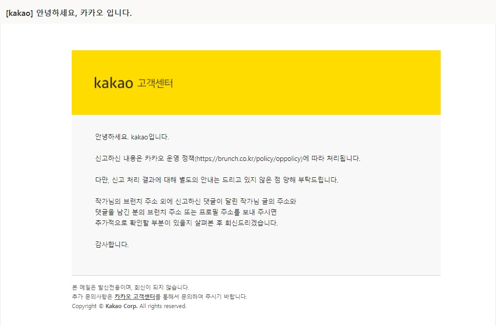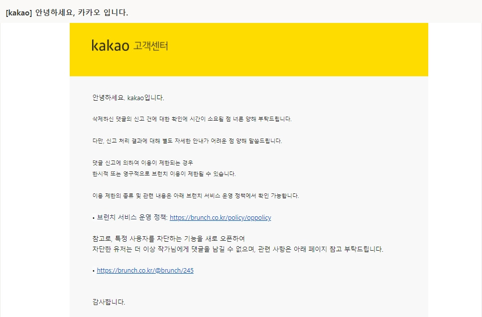 개별적으로 카카오 브런치 고객센터에 문의했더니 받은 답장.