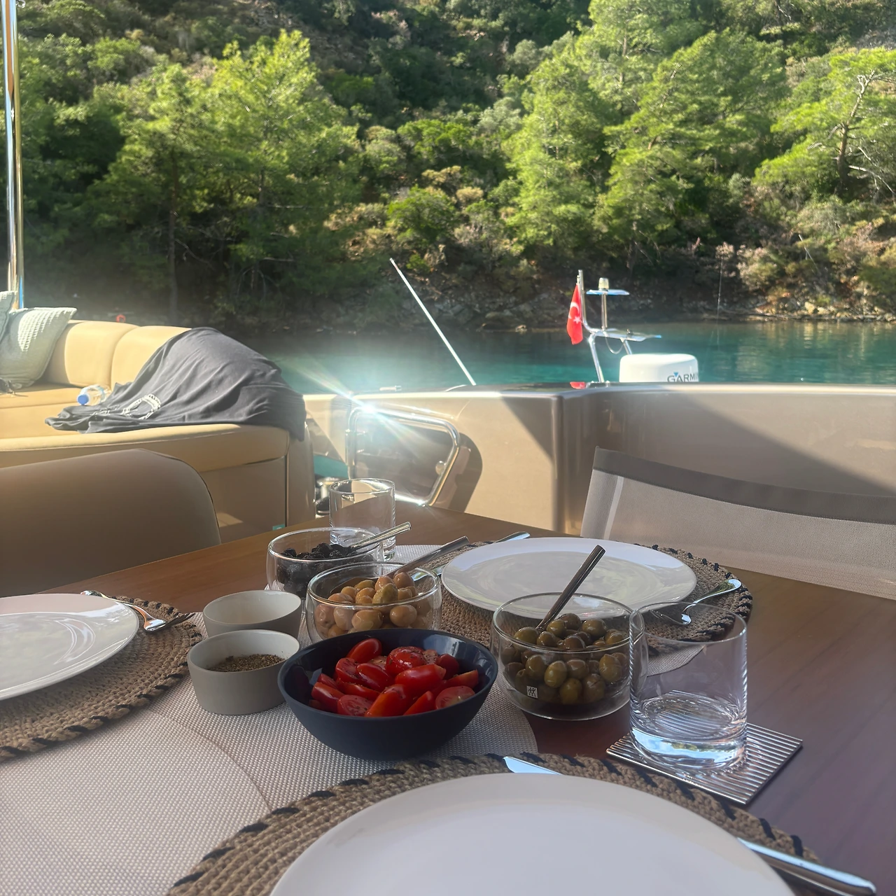 햇살이 드는 바다뷰와 함께 먹는 빵과 치즈,