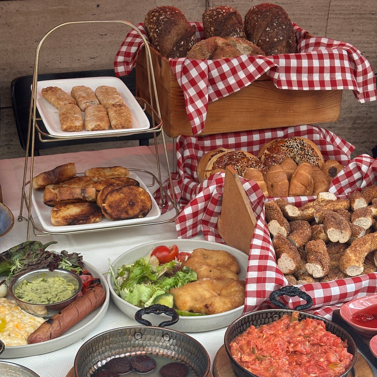 옆에는 소시지와 달걀 요리, 허브 향이 은은한 소스와 약간의 채소가 더해진다.
