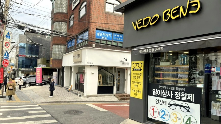 안경점과 함께 작은 골목이 나와요. 동물병원과 아름다운가게도 보이지요? 안경점이 코너에 있는 골목으로 들어가세요. 아름다운 가게 쪽으로 걸어가도 길이 나오지만 조금 돌아가셔야 해요. ㅠㅠ