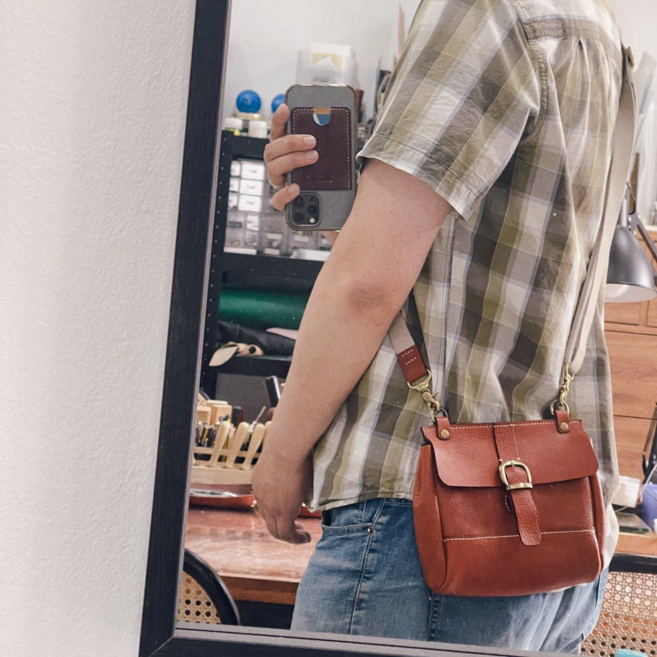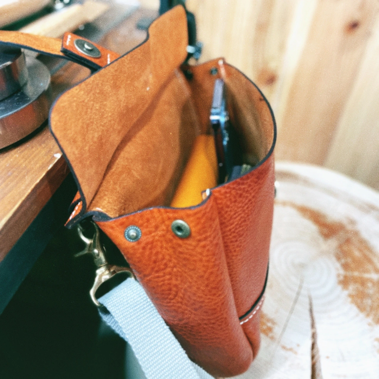 공방엔 사진 촬영 등을 위해 만든 샘플 가방이 있는데요. 전시 공간이 부족하면 저렴하게 팔거나 새로운 제품으로 리폼하기도 해요. 얼마 전에 그렇게 제품 하나를 리폼해보았답니다. ^^ 미네르바 복스가 사용된 가방인데 전시만 되었던 제품인데 은근히 태닝이 많이 되었던 가방이지요.