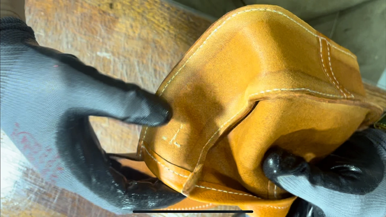 뒤집어 만드는 가방이기 때문에 부드러운 가죽을 사용해야 해요. 그래서 이탈리야 최고급 소가죽인 미네르바 복스를 사용했답니다. 주름 모양을 찍어내는 크롬 가죽과는 다르게 거대한 드럼에서 접혔다 펴지기를 반복하며 생긴 주름이기 때문에 같은 부분 없이 자연스러운 것이 특징이랍니다.