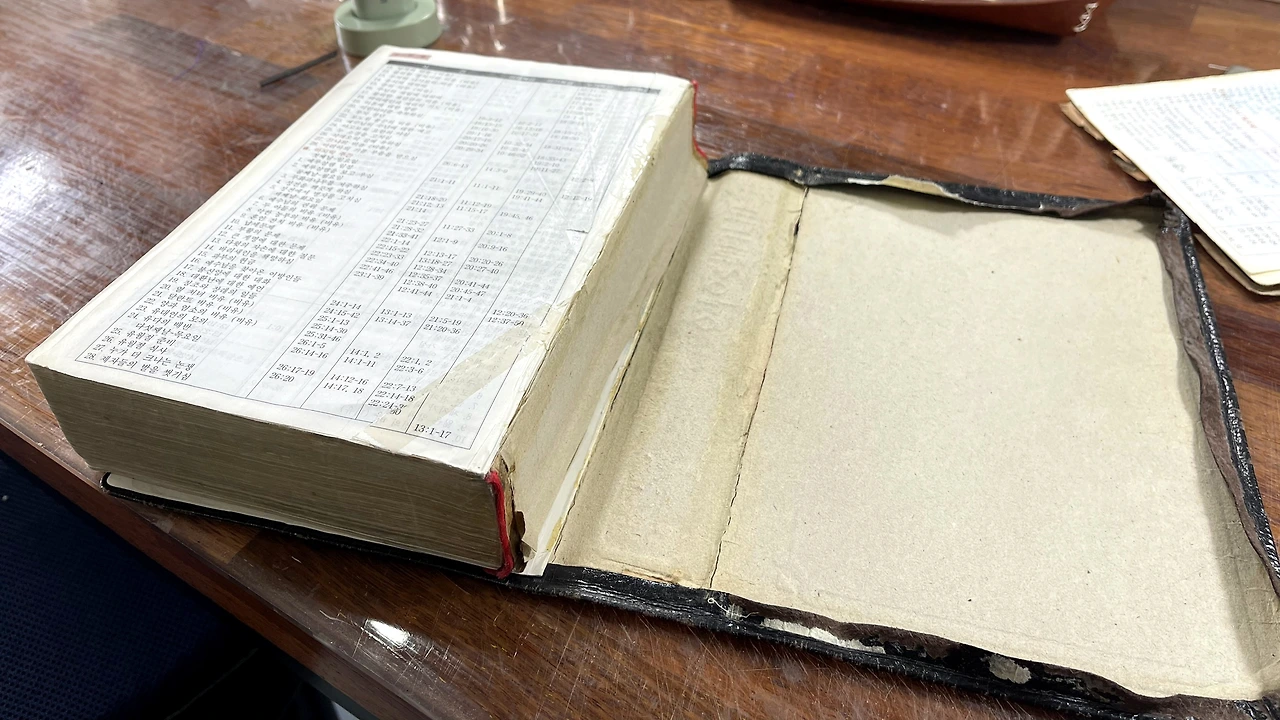 책등 부분의 파손된 부분도 보강해 주고 중간중간 분리된 부분도 테이프로 수리했어요. 이때 일반 테이프를 사용하면 오히려 책이 더 파손될 수 있어요. 꼭 책 수리용 테이프를 사용해야 해요.