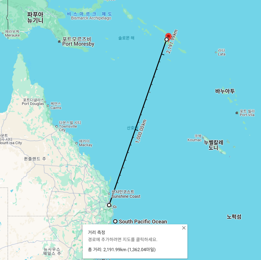 브리즈번에서 솔로몬 군도까지는 대략 2,191km 거리이다.