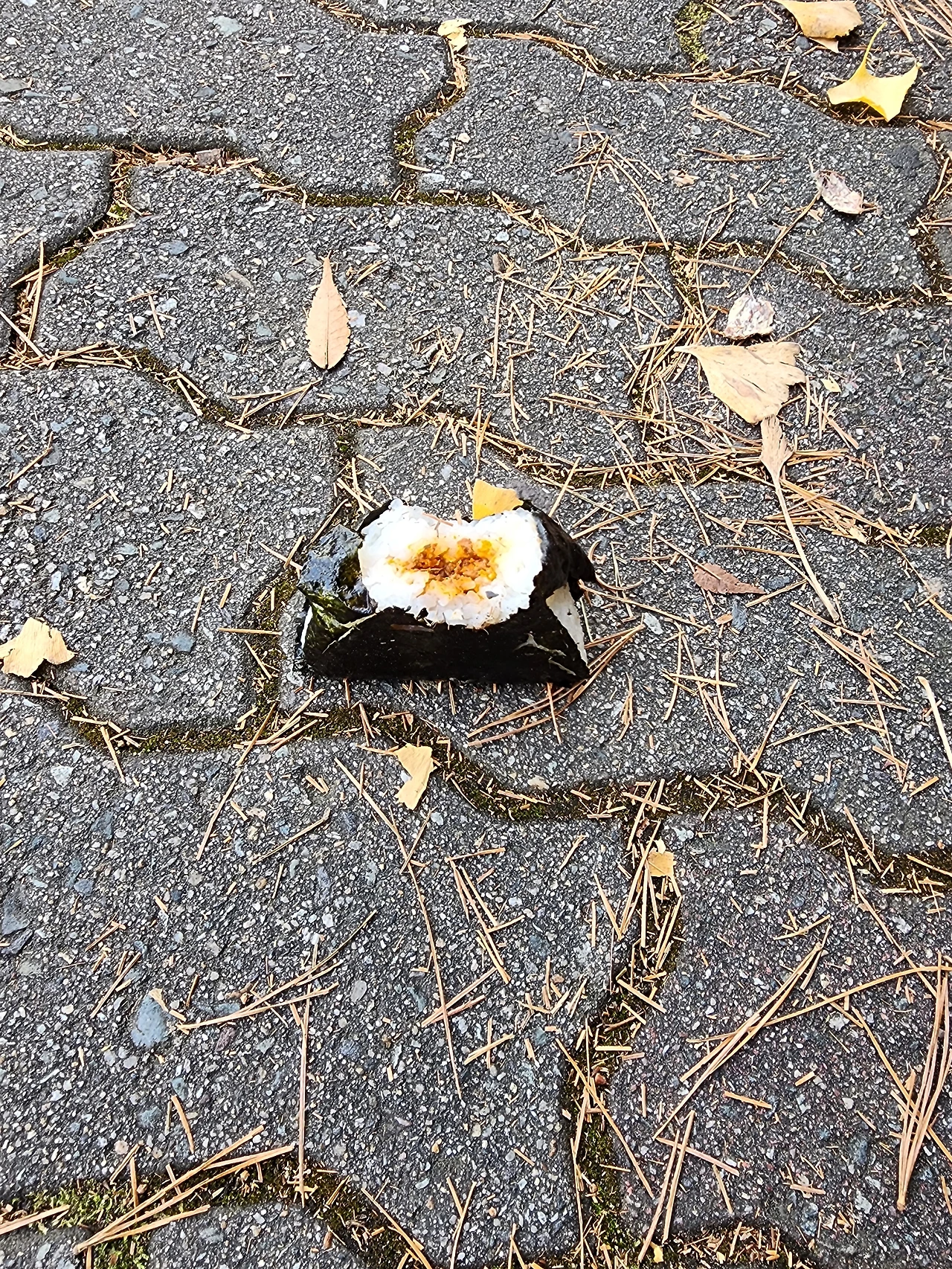 우연히 아침 걷기 중에 보도블록 한가운데 떨어진 삼각김밥을 보게 되었다. 누군가 한 입을 베어 문 자국이 선명하였다. 누군가 한 입을 베어 물고 방심한 탓에 길바닥에 떨어진 것 같았다. 그런데 떨어진 삼각김밥은 오뚝이처럼 서 있었다. 삼각김밥을 음미하던 누군가는 얼마나 갈등했을까? '삼각김밥 바닥만 빼고 먹으면 될까? 떨어진 지 3초 가 안 지났으니, 괜찮지 않을까?'