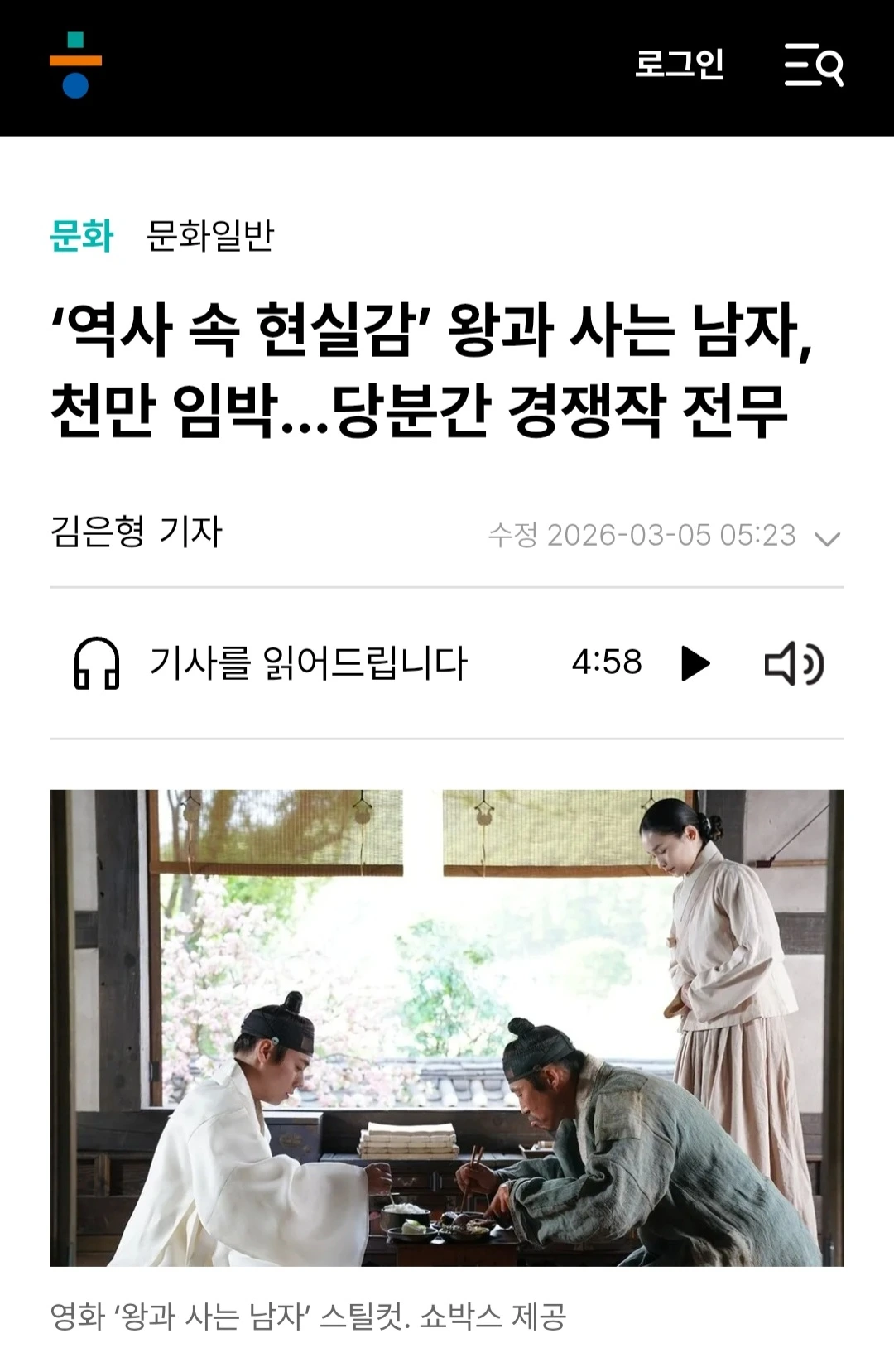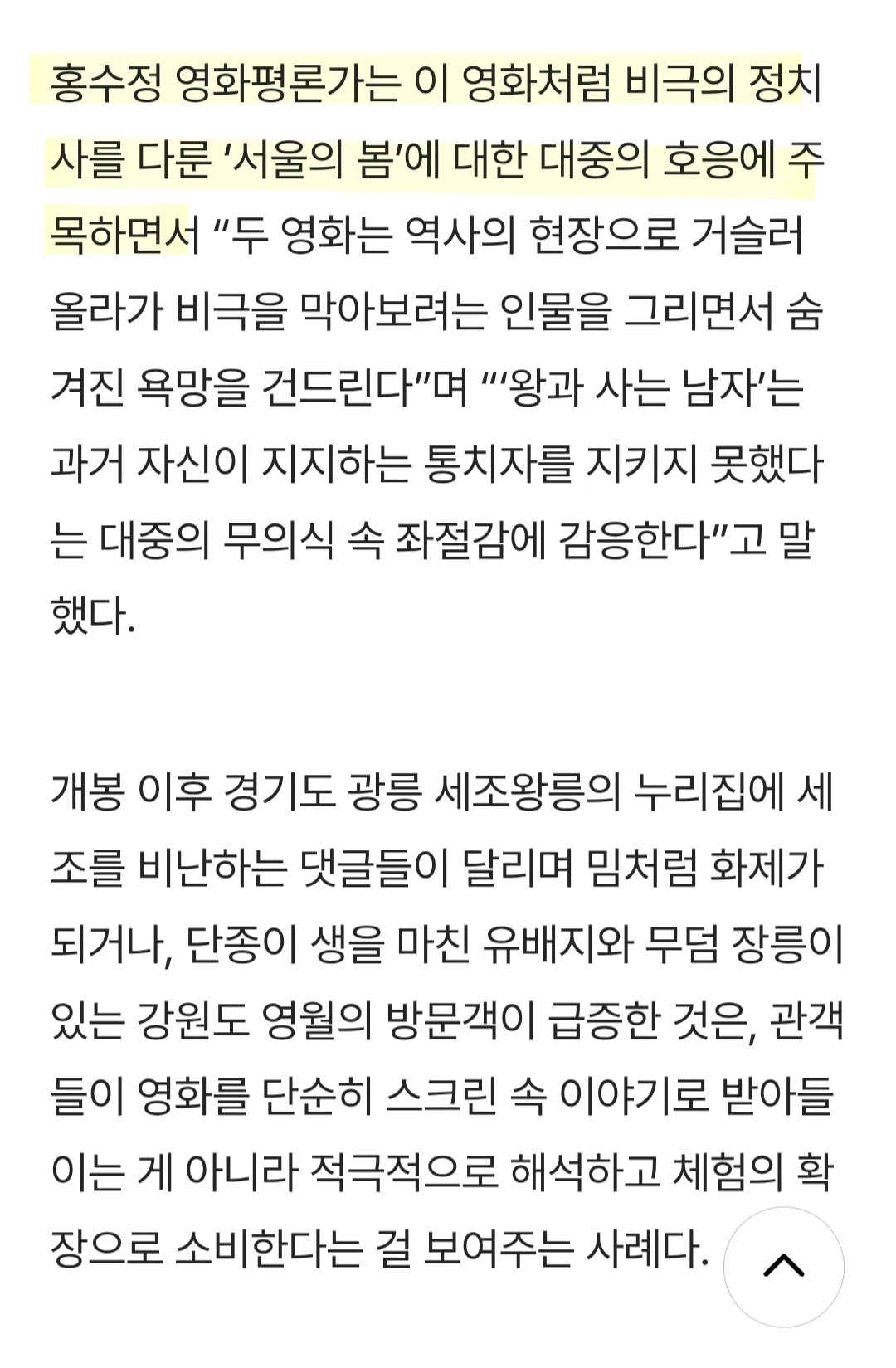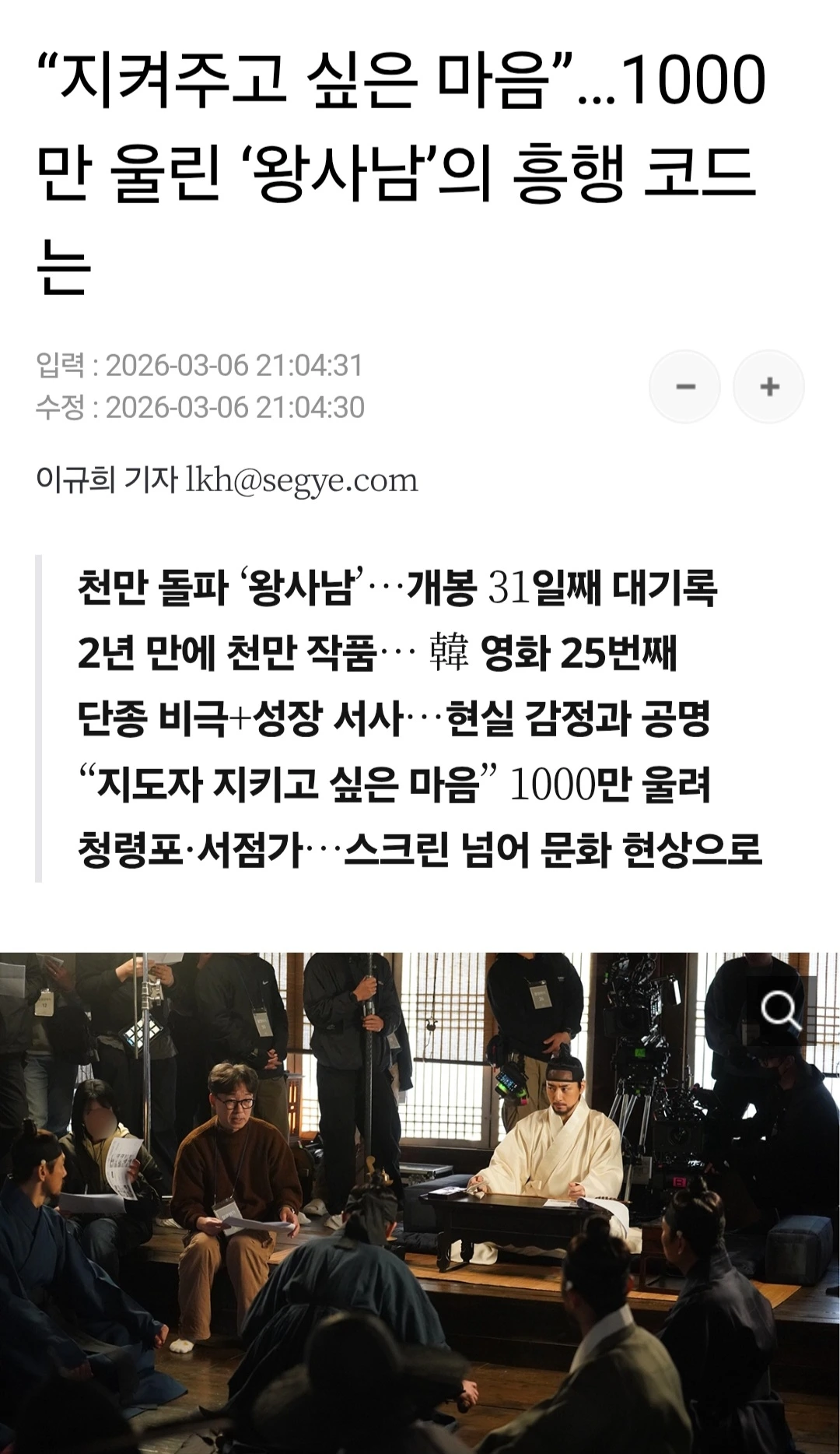 어떤 작품이 천만 관객을 소환했다는 것은, 그 작품에 내재된 힘을 넘어 관객의 문화적 코드와 접속에 성공한 것이다. <왕사남>의 경우는 자신이 지지한 통치자의 마지막을 보필하고 싶은 마음이라 나는 분석했다. 많이 주목해주셔서 감사할 따름. 그 외에도 여러 해석이 가능할 것이다.