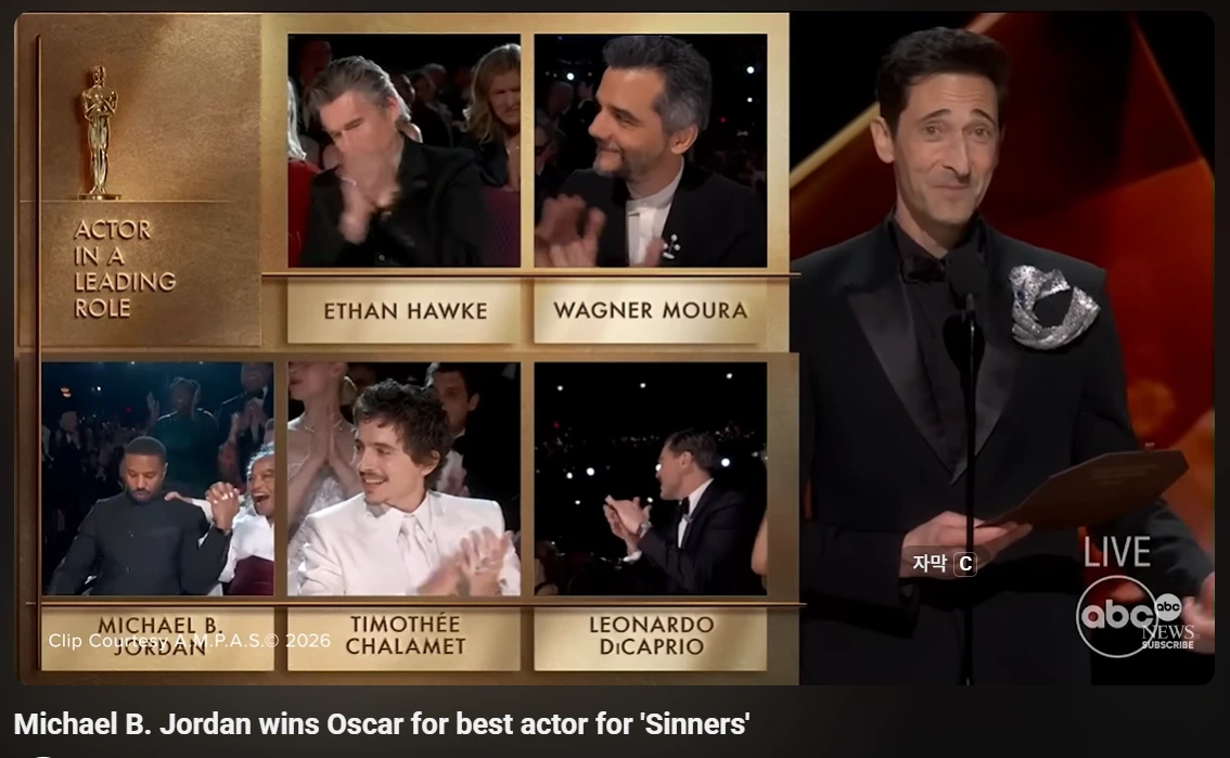 이번 남우주연상은 레오나르도 디카프리오, 마이클 B. 조던, 티모시 샬라메의 3파전이었는데, 이들은 각각 70, 80, 90년대생으로 각 세대 대표배우의 격돌로도 볼 수 있는 한 판이었다. 결국 상은 <씨너스: 죄인들>에서 1인 2역으로 화려한 연기를 보여준 조던에게 돌아갔다. 흑인 배우 계보를 이을 스타의 탄생.