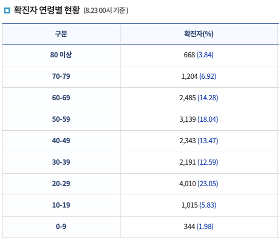 2020-08-23 기준 코로나 확진자 연령별 현황 @질병관리본부