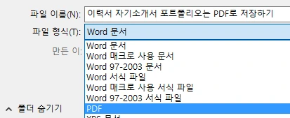 이력서나 자기소개서를 만들었다면, 그걸 '완성'하는 행위가 PDF로 변환 버튼이에요. 워드/엑셀로 작성한 후에 F12 버튼을 눌러서 포맷 보시면 PDF가 있어요. 정말 중요한 기능이니 꼭 활용하시길 바랍니다.