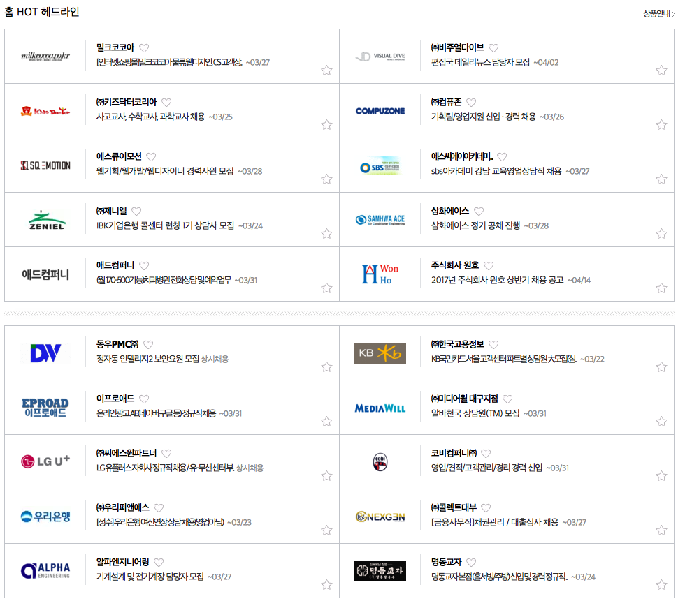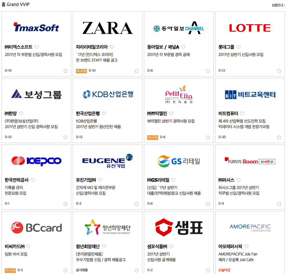 더 큰 문제는 채용 광고의 비용에 따라서 던져진 그물에 우수 인재가 들어올 확률이 달라진다는 점입니다. 아래 사진은 채용 포털의 메인 화면에서 가장 상위에 큰 이미지로 잡혀있는 가장 비싼 광고의 모습과 가장 하단에 가장 작은 이미지로 잡혀있는 가장 저렴한 광고의 모습입니다.