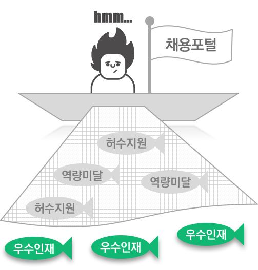하지만 문제는 원하는 인재를 찾기 위해서는 채용 광고를 통해 유입된 지원자를 다시 기업에서 원하는 인재가 맞는지 판별하기 위해 많은 절차를 거쳐야 한다는 점입니다. 예를 들어 대기업 공채의 경우 1,000명 채용에 20,000명이 지원했다고 가정합시다. 이 경우 먼저 각 지원자에 대한 면접 여부의 결정입니다. 하지만 2만 개의 지원서를 모두 읽으면서 면접의 여부를 결정하는 것이 어렵습니다. 따라서 특정 값에 따라서 필터를 하기도 하고, 인적성 검사를 통해 면접 대상을 가려내기도 합니다. 문제는 20,000명의 지원자 중에 사실은 채용하는 기업과 직무에 역량면에서나 성향 면에서 맞지 않은 지원자가 있음에도 이를 걸러내기 위해 막대한 비용을 지출하고 있다는 점입니다. 이유는 신입 지원자라는 거대한 바다 속에서 자신들이 찾고 있는 사람이 정확히 어디 있는지 알 수가 없기 때문에 기업에서 원하지 않는 사람에게 까지 모두 채용 사실을 알리고 지원자 전체를 서류전형이라는 채용 전형에 태워야 하기 때문입니다.