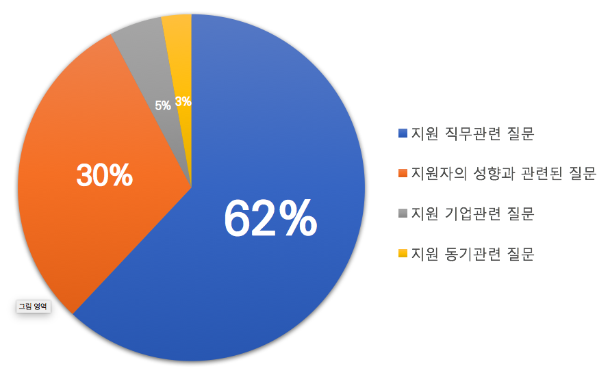 62%로 가장 큰 비중을 차지한 질문의 유형은 '직무'와 관련된 질문이었으며, 그 다음은 지원자의 '성향'을 묻는 질문이 30%를 차지하였습니다. 이는 너무 당연한 결과일 수 있지만 면접관은 지원자가 지원하는 직무와 관련된 역량과 관심이 있는지를 가장 많이 질문하였고, 그 다음으로 지원자가 어떤 성향의 사람인가에 대한 질문을 통해 지원자를 파악하고자 한다고 생각할 수 있을 것 같습니다.