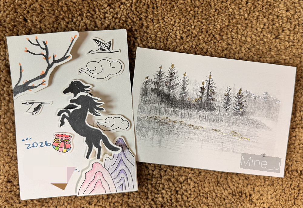 다음은 부모님께 드릴 신년카드다. 신년카드에 주로 들어가는 이미지를 그려 붙이고(내년은 말의 해라 두 마리를 넣어보았다) 인사 문구를 넣고 마무리. 뒷면은 나무에 반짝이 좀 뿌려주고(특히 골드) 마무리. 좋아해 주시겠지!