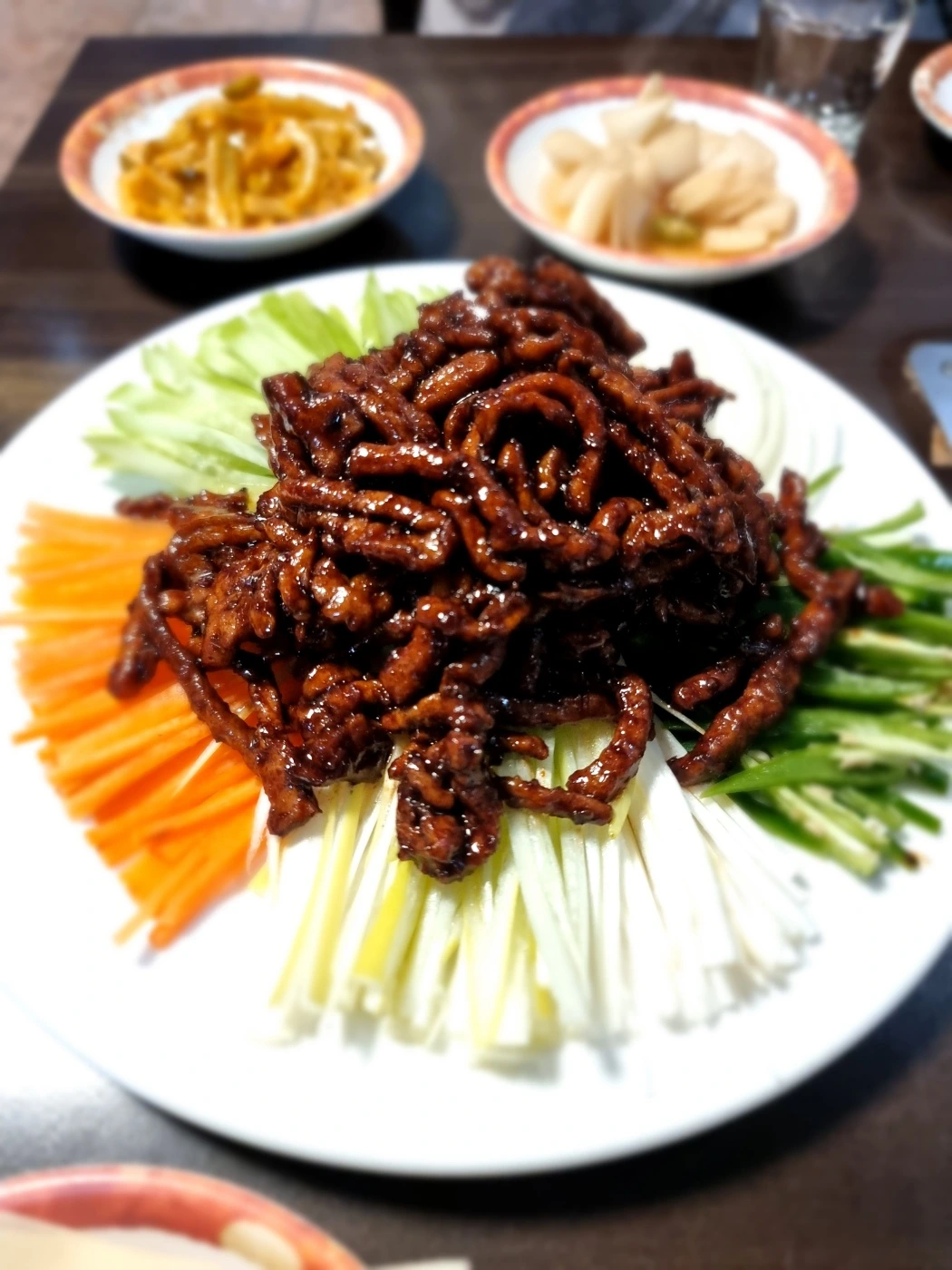 양꼬치집에서는 양꼬치만이 아니라, 중국 요리의 깊은 매력도 함께 즐길 수 있었다. 그중에서도 내가 사랑하게 된 요리는 경장육슬(징장러우쓰)였다. 채 썬 파, 오이, 당근, 양파가 가지런히 놓여 있고, 춘장에 볶아진 돼지고기가 그 위에 얹힌다. 한입 크기로 잘린 건두부에 이것을 올려 입으로 가져가면, 짭짤한 춘장의 감칠맛과 돼지고기의 고소함, 아삭한 채소의 싱그러움이 완벽한 균형을 이루며 퍼진다. 씹을수록 깊어지는 풍미 속에서 건강함과 만족감을 동시에 느낄 수 있었다.