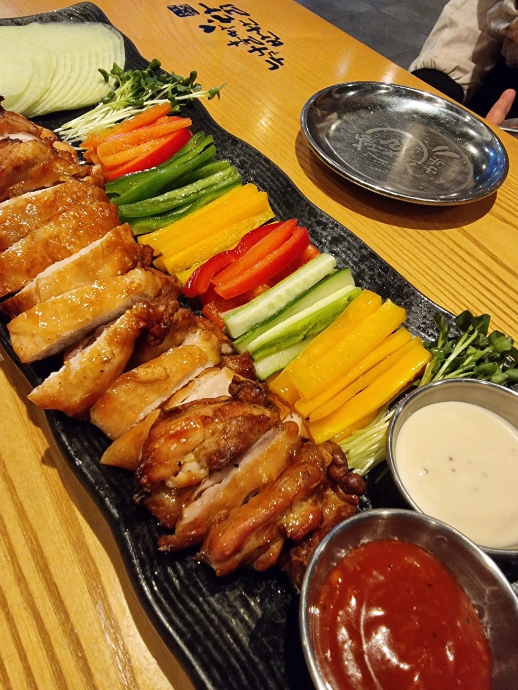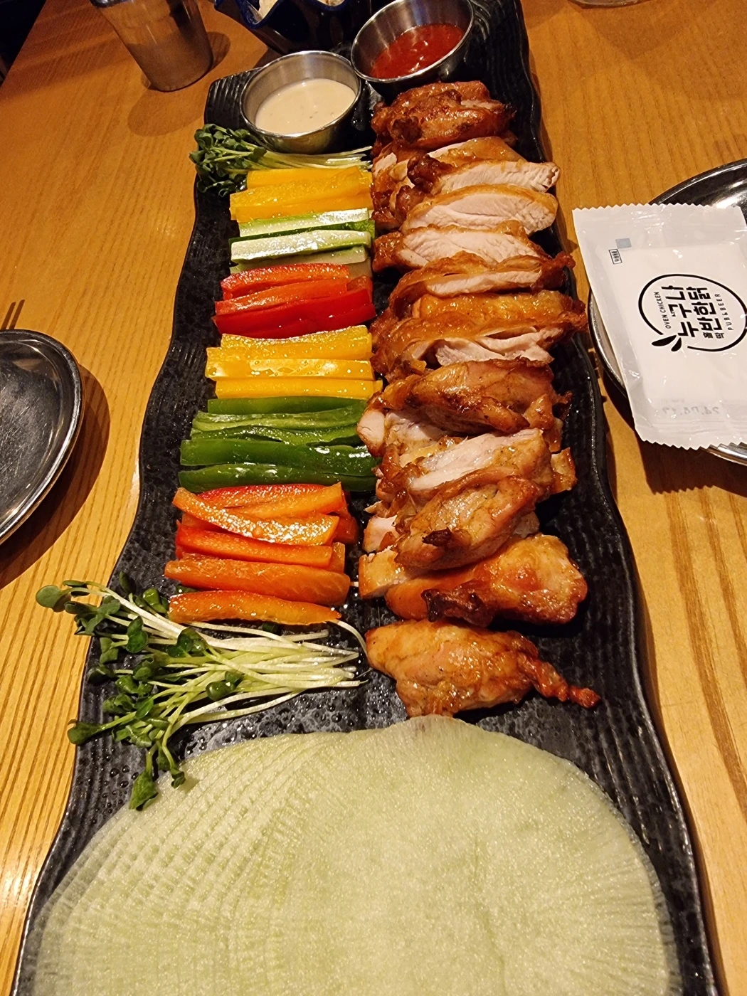 각종 신선한 채소들이 함께 어우러져 ‘쌈’이라는 형태로 먹을 수 있다는 것. 빨간색, 노란색, 녹색의 파프리카, 채 썬 오이, 그리고 무순까지. 거기에 쌈무를 더해 닭고기와 함께 싸서 한 입에 넣으면,