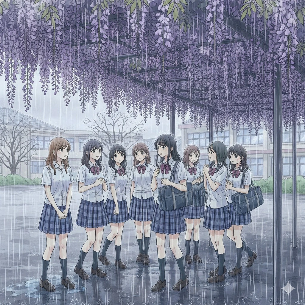 등나무 아래 모여 비가 그치길 기다리던 오후,