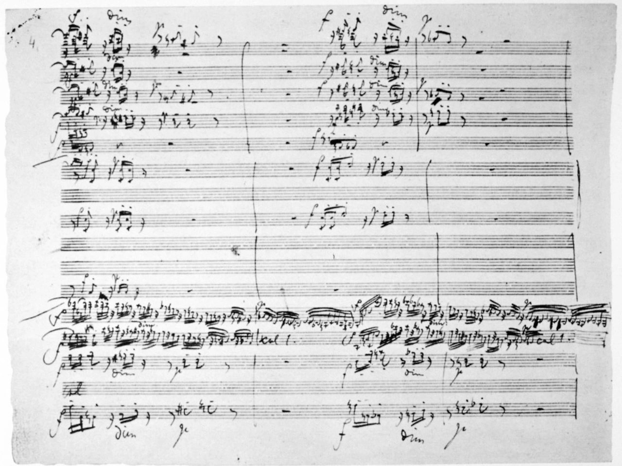 헝클어진 금발 머리와 두꺼운 악보 묶음을 들고
