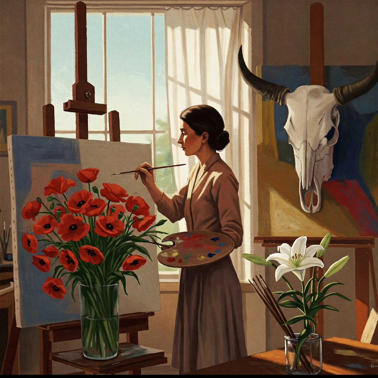 뼈가 마른 들소 해골, 붉고 거대한 양귀비. 무한히 펼쳐진 하늘 아래 그녀는 붓을 들었다.