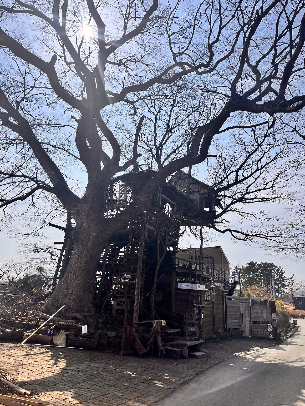 사진으로 본 트리하우스는 도대체 어떤 구조인가 궁금했는데 입구의 커다란 나무에 얼기설기 짜인 나무집이다.
