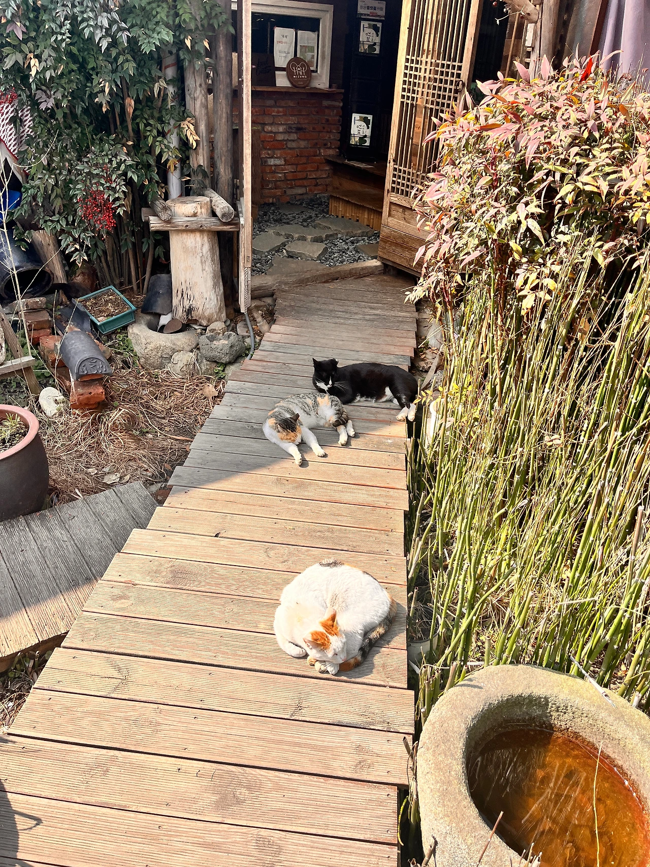 카페 입구에는 고양이 세 마리가 낮잠을 자고 있다.