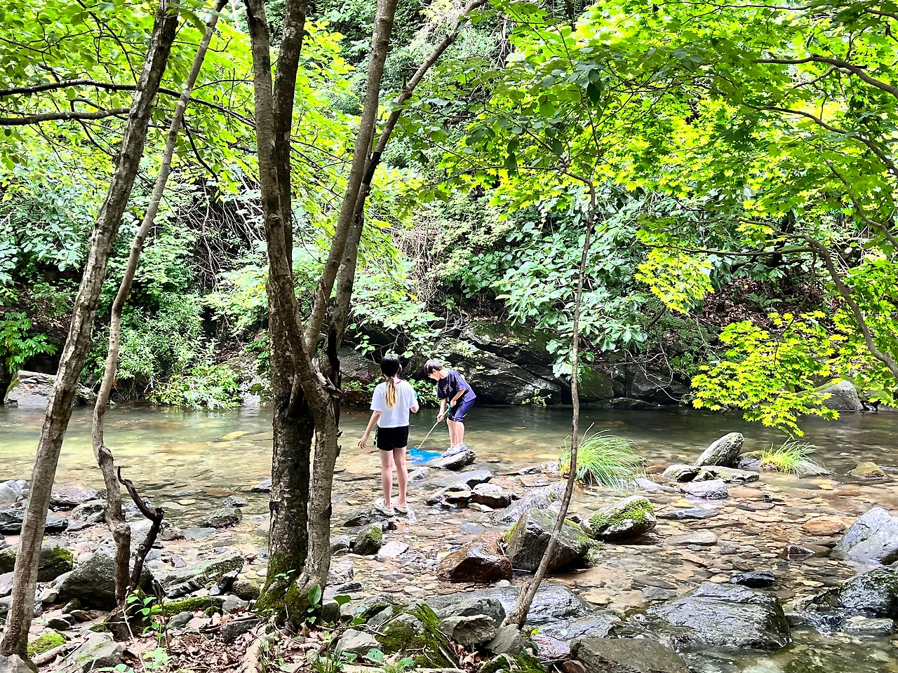 남편이 식사를 준비하는 동안 아이들과 옆에 있는 계곡에 내려갔다.